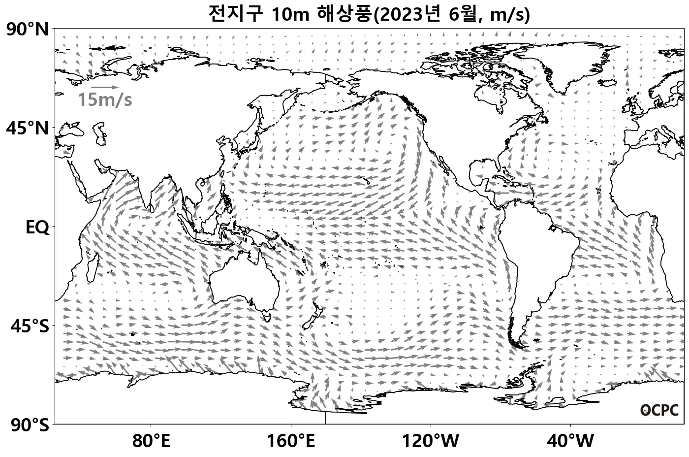 1993~2023년 동안 전지구, 동아시아해역의 6월 해상풍속은 큰 변화없이 유지(10년에 0.0m/s)되는 추세입니다.