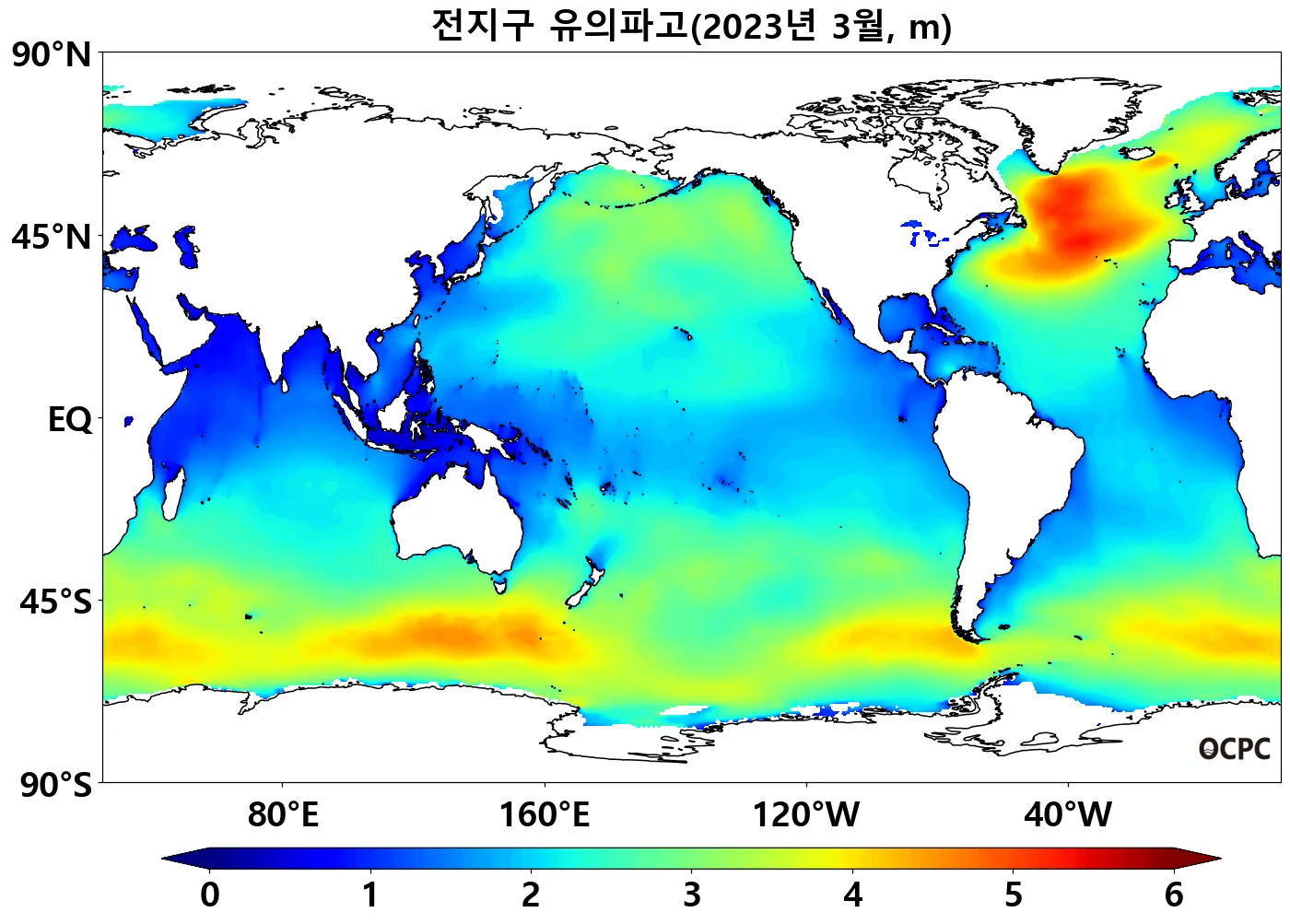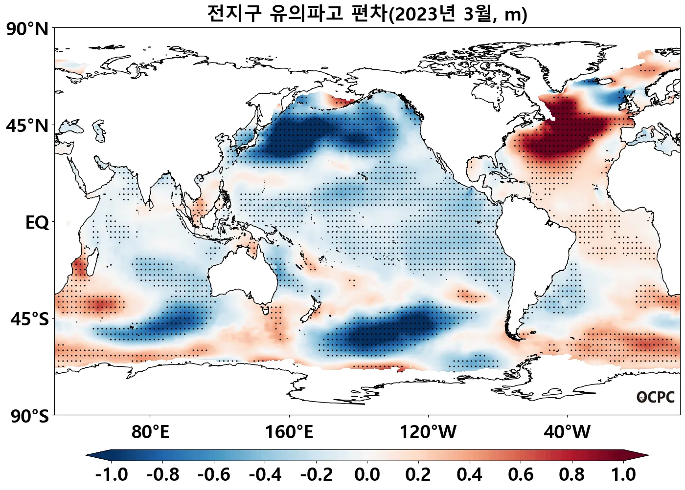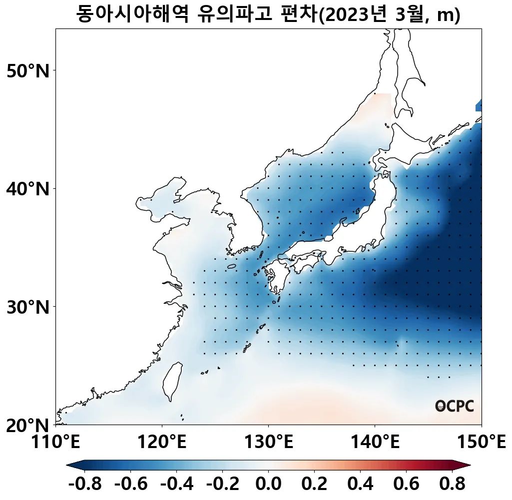 동해의 평균 유의파고는 평년(1.4±0.2m)보다 0.3m 감소했고, 1981~2023년(3월) 중 가장 낮았습니다.