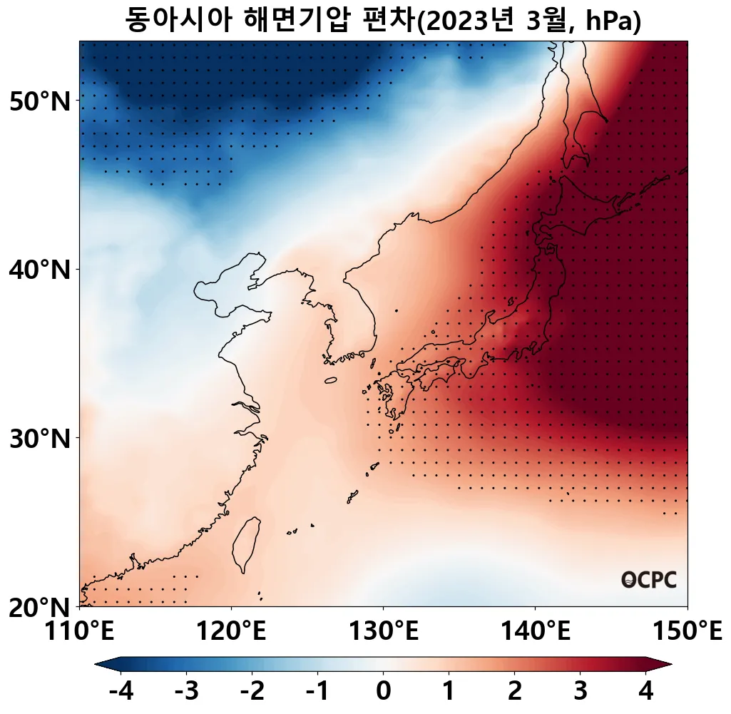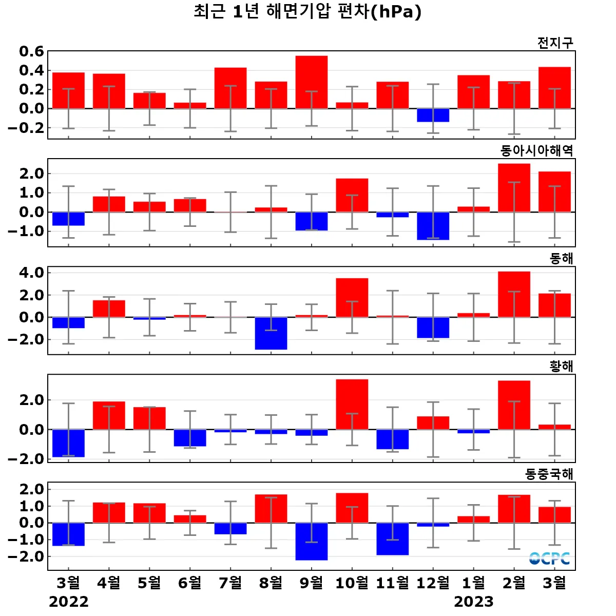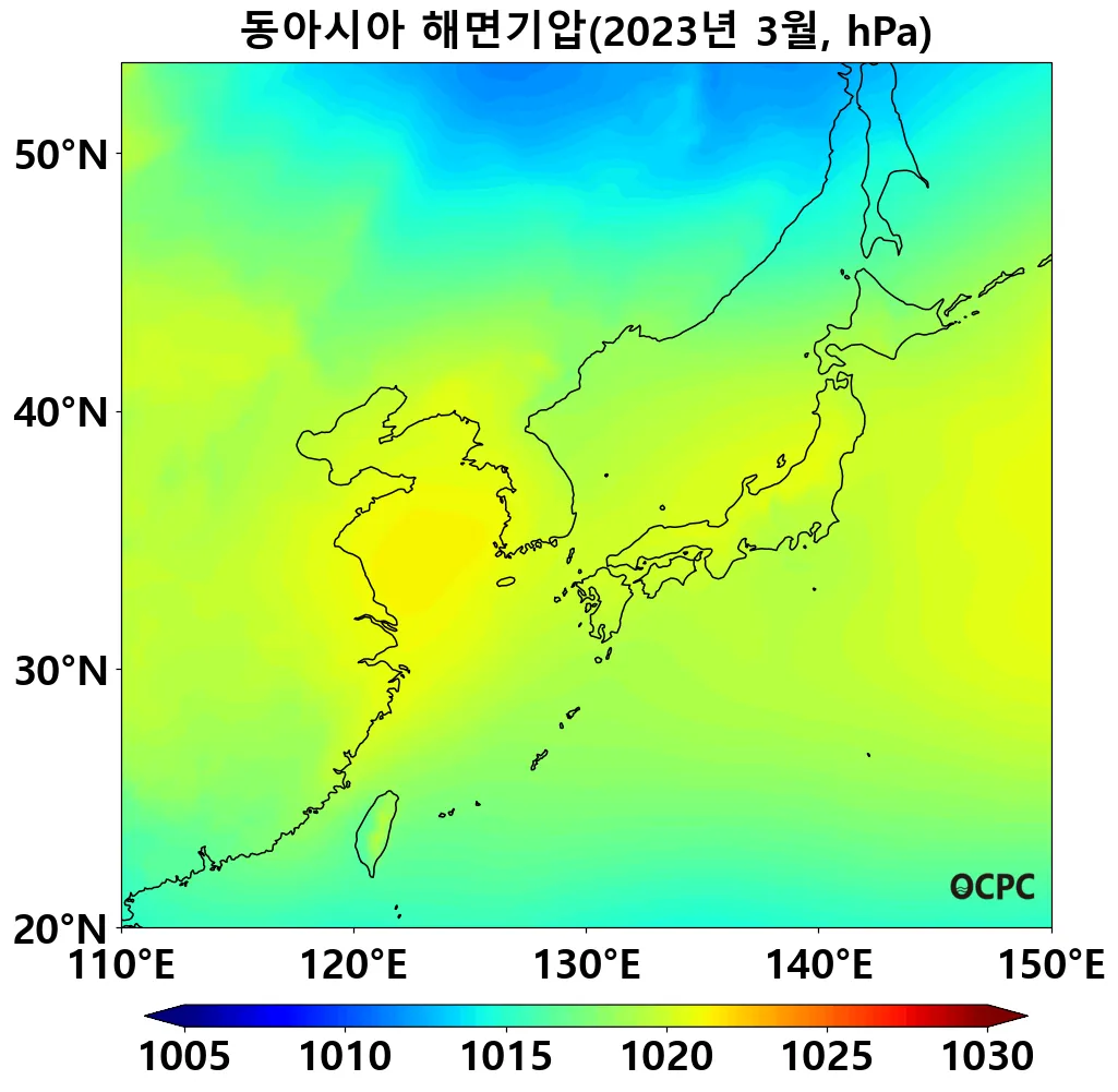 황해, 동해, 동중국해의 해면기압은 평년(1020.5±1.8hPa, 1016.3±2.4hPa, 1018.6±1.3hPa)보다 소폭 0.3hPa, 2.2hPa, 1.0hPa 높은 수준으로 평년과 비슷합니다.