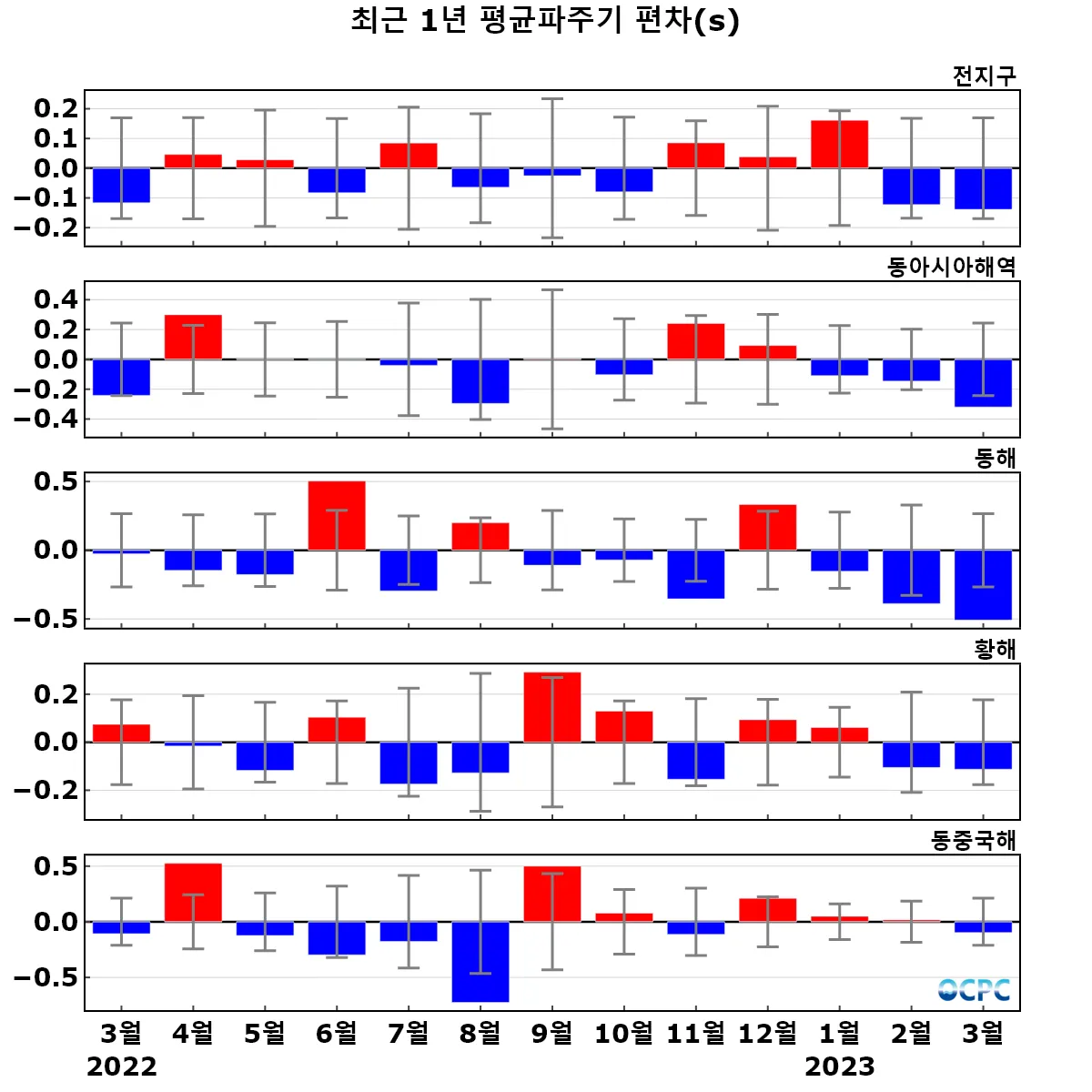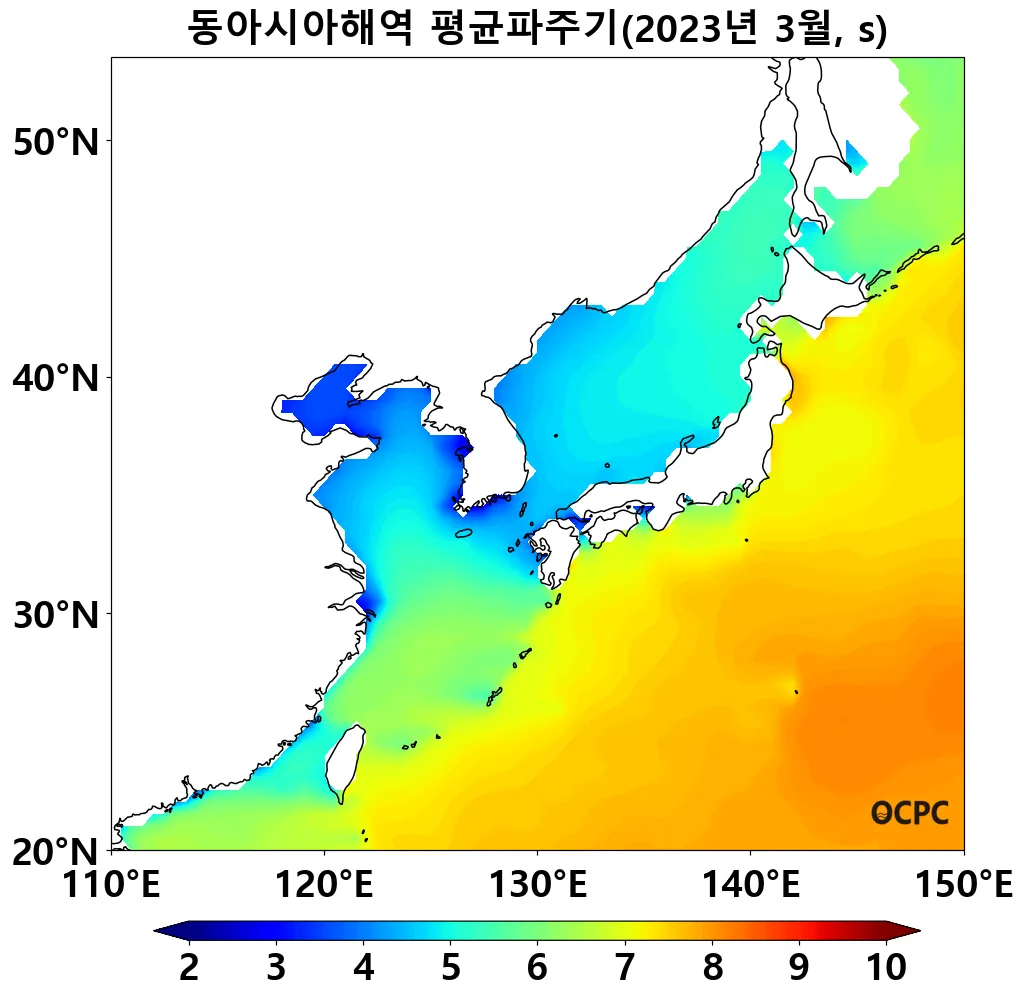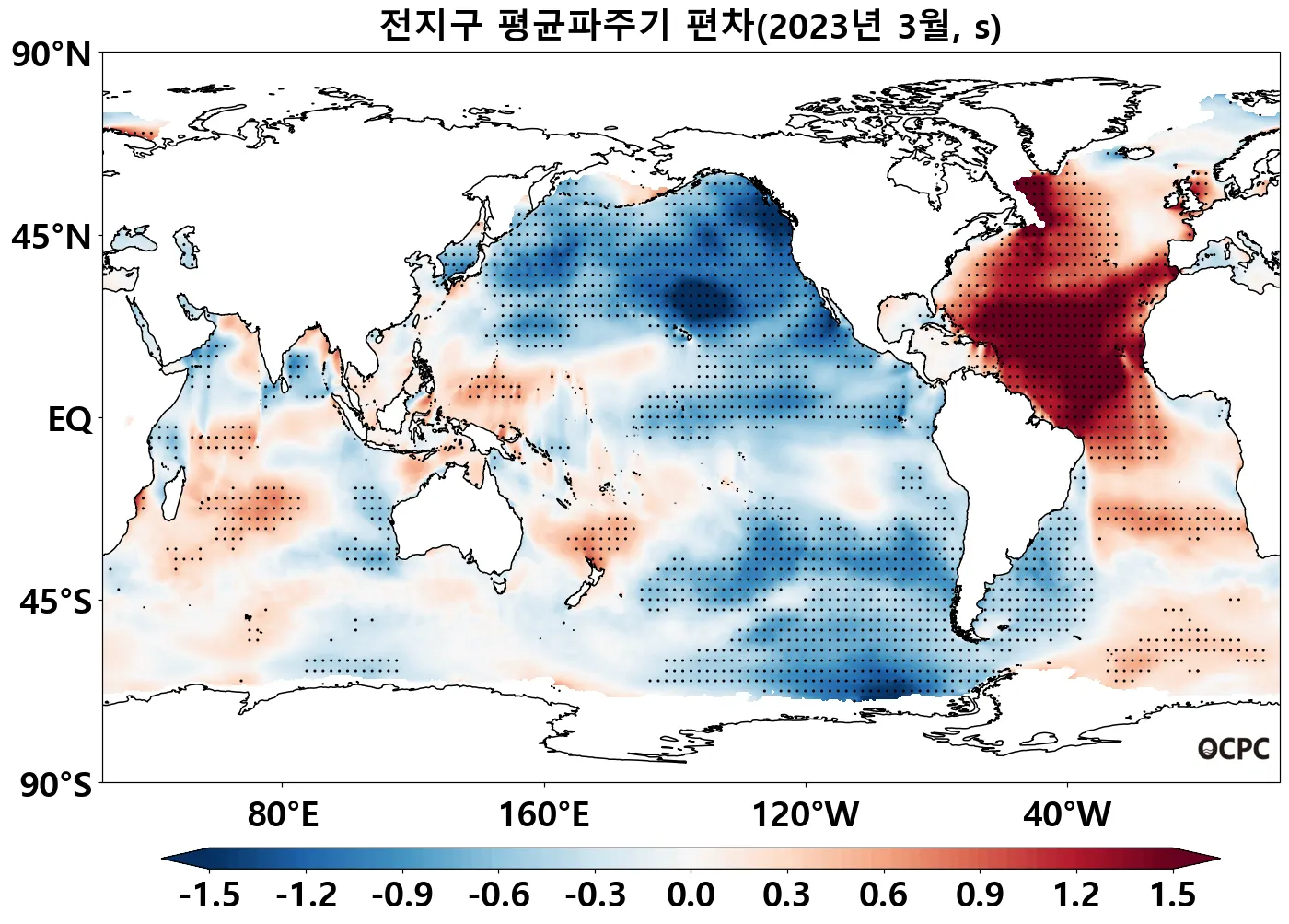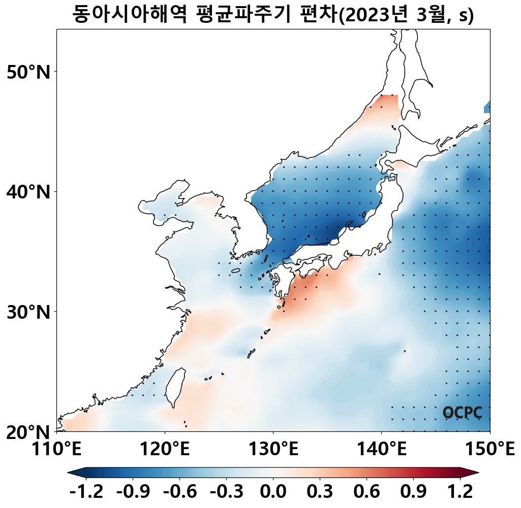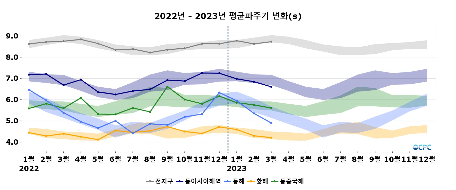 동해의 평균파주기는 평년(5.4±0.3초)보다 0.5초 감소했고, 1981~2023년(3월) 중 가장 짧았습니다.