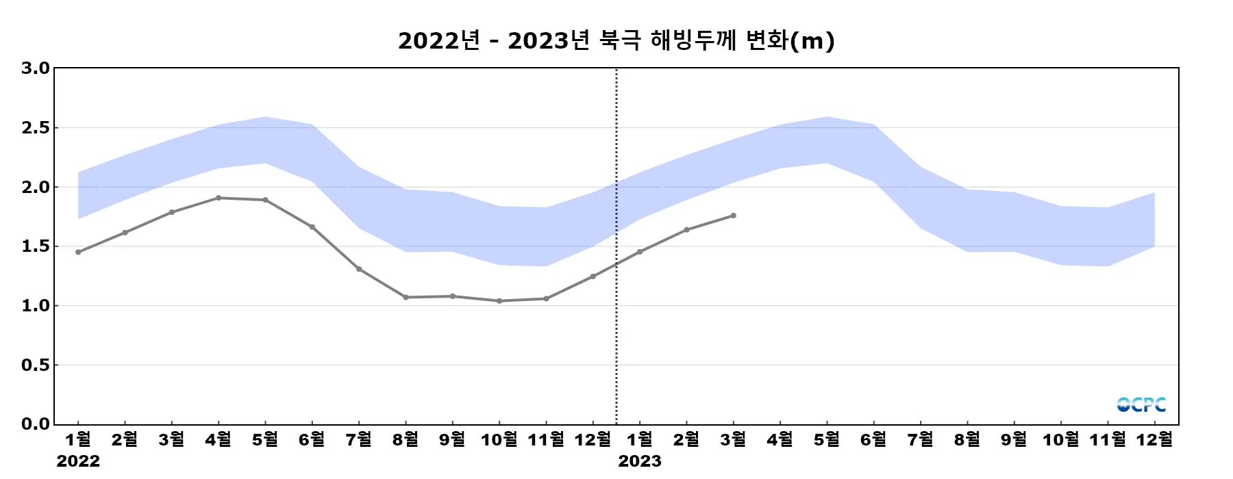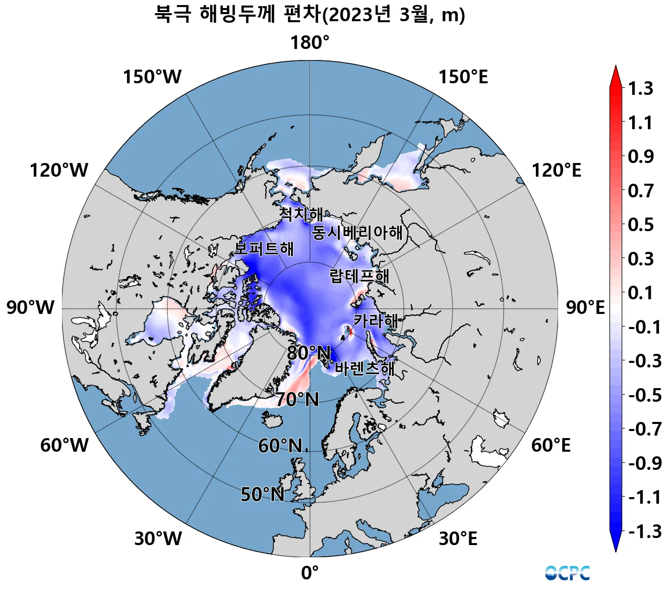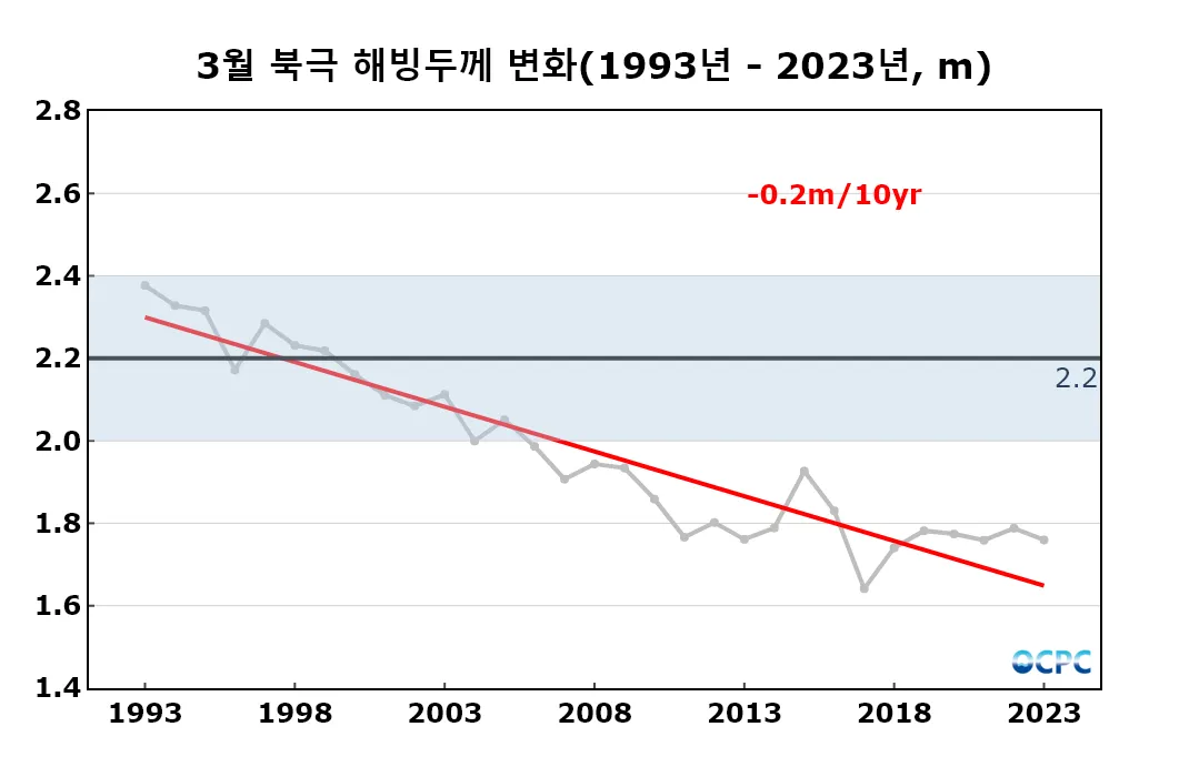 3월 해빙두께는 평년(2.2±0.2m)보다 약 0.46m(20.7%) 감소했으며, 1993~2023년 동안 10년에 약 0.2m씩 감소하는 추세입니다.