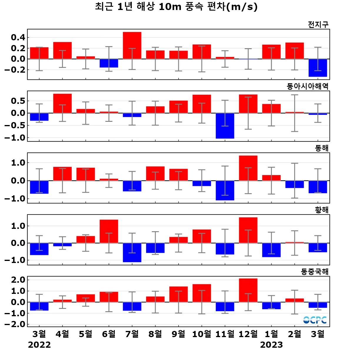 황해, 동해, 동중국해의 해상풍속은 평년(2.0±0.4m/s, 2.8±0.7m/s, 3.4±0.7m/s)보다 각각 0.5m/s, 0.7m/s, 0.5m/s 약했습니다.