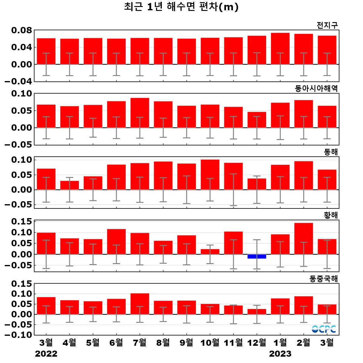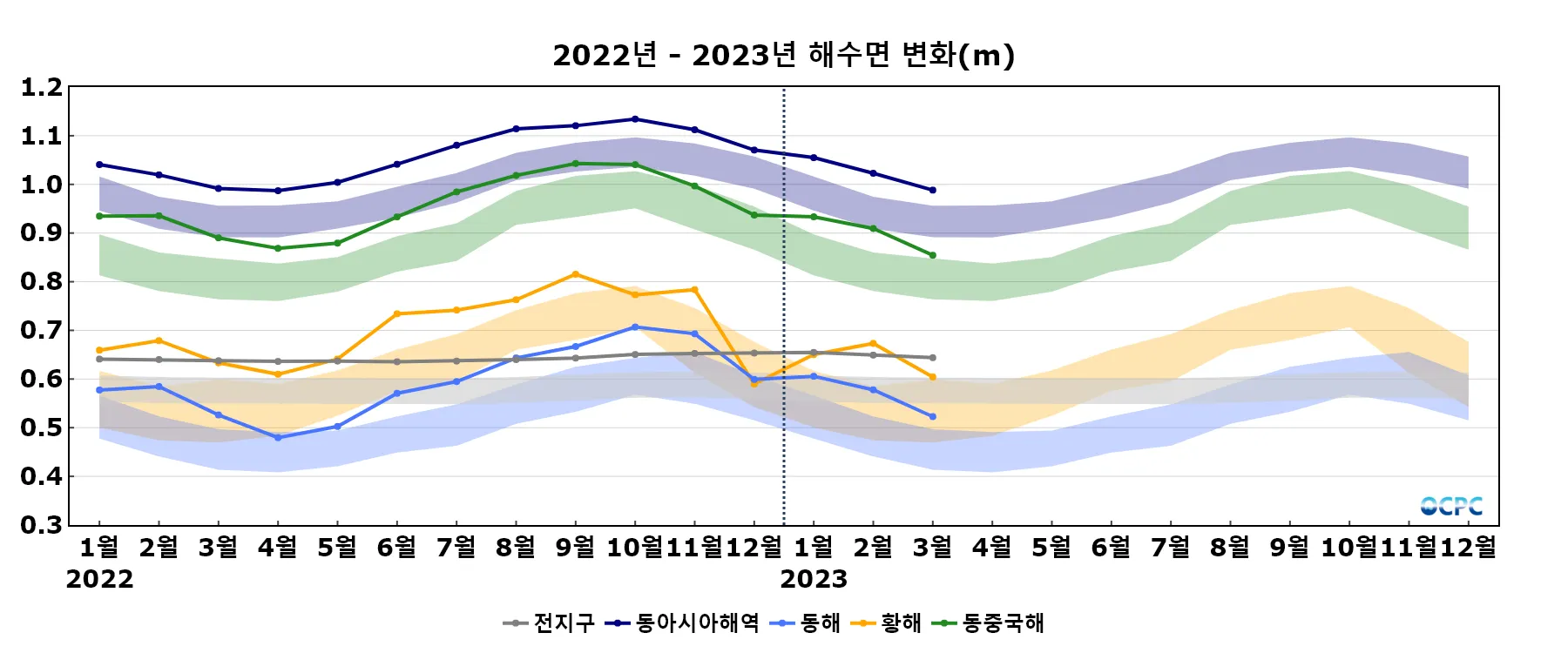 1993~2023년 동안 전지구 평균 3월 해수면은 10년에 3.4cm씩 상승하는 추세입니다. 동아시아해역은 10년에 3.4~4.9cm씩 상승하는 추세이며, 그 중 황해의 상승률이 가장 큽니다.