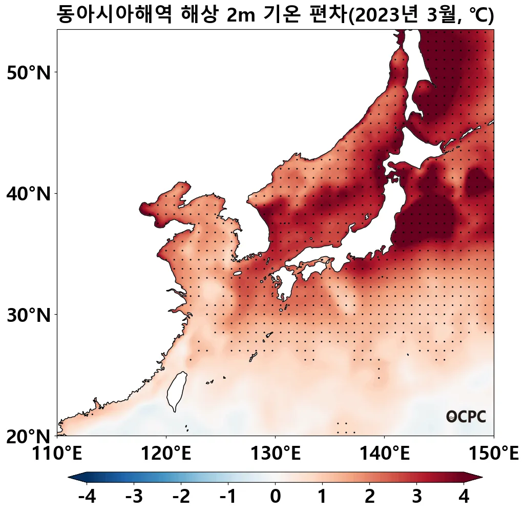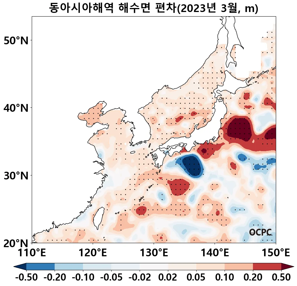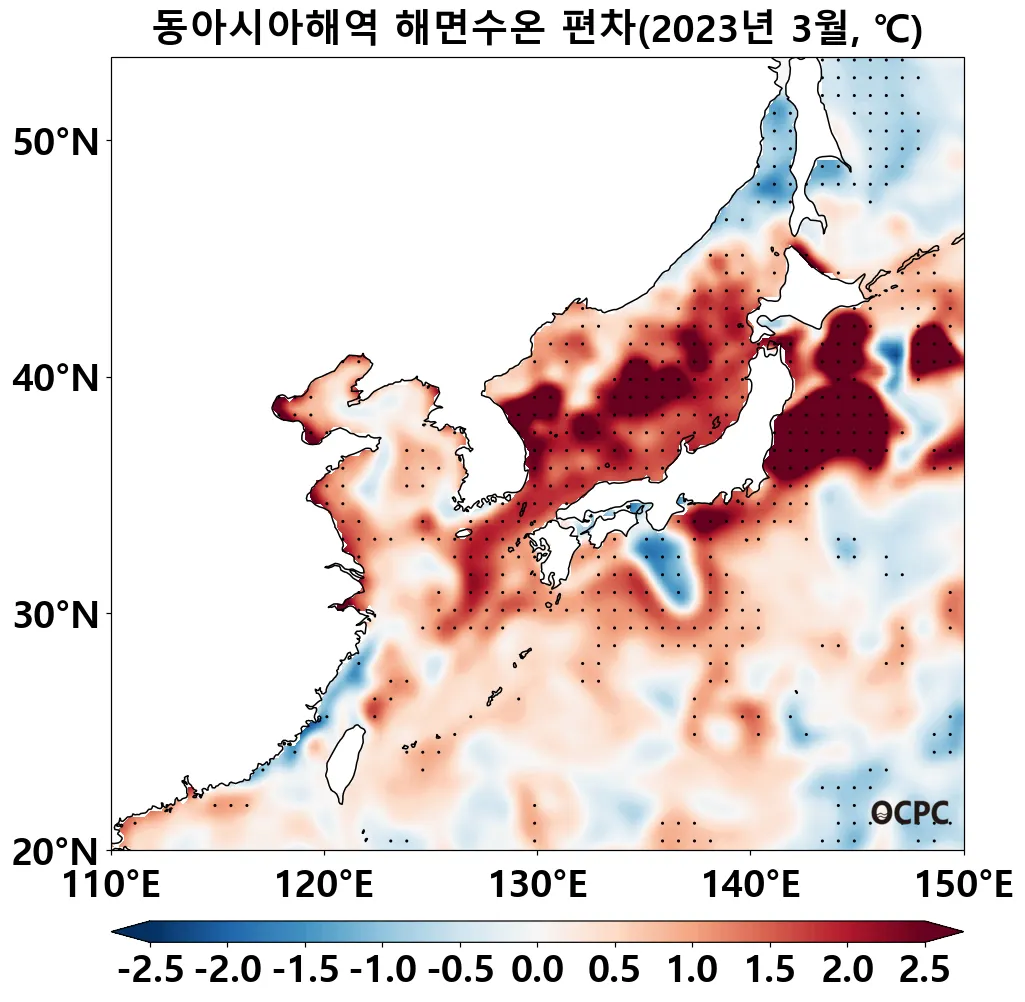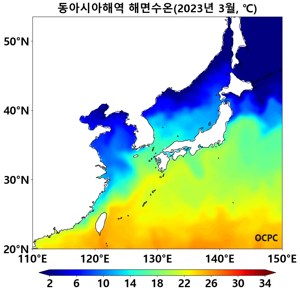 동아시아해역은 평년(14.9±0.3°C)보다 1.5°C 높아 1982~2023년(3월) 중 가장 높았으며, 쿠로시오 해류와 오야시오 해류가 만나는 해역(140°E~148°E, 35°N~43°N)과 동해의 상승이 두드러졌습니다.