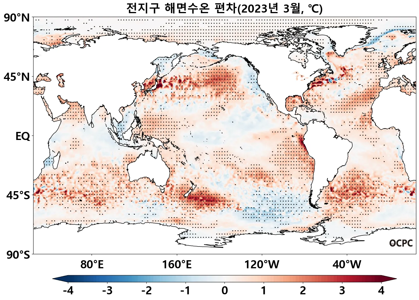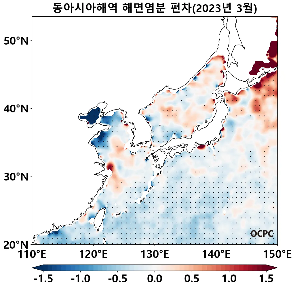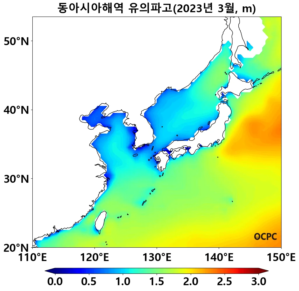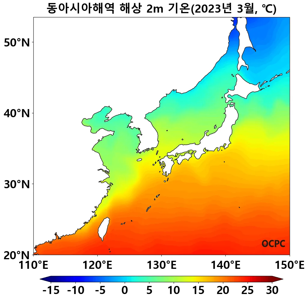 동아시아해역은 평년(14.9±0.3°C)보다 1.5°C 높아 1982~2023년(3월) 중 가장 높았으며, 쿠로시오 해류와 오야시오 해류가 만나는 해역(140°E~148°E, 35°N~43°N)과 동해의 상승이 두드러졌습니다.