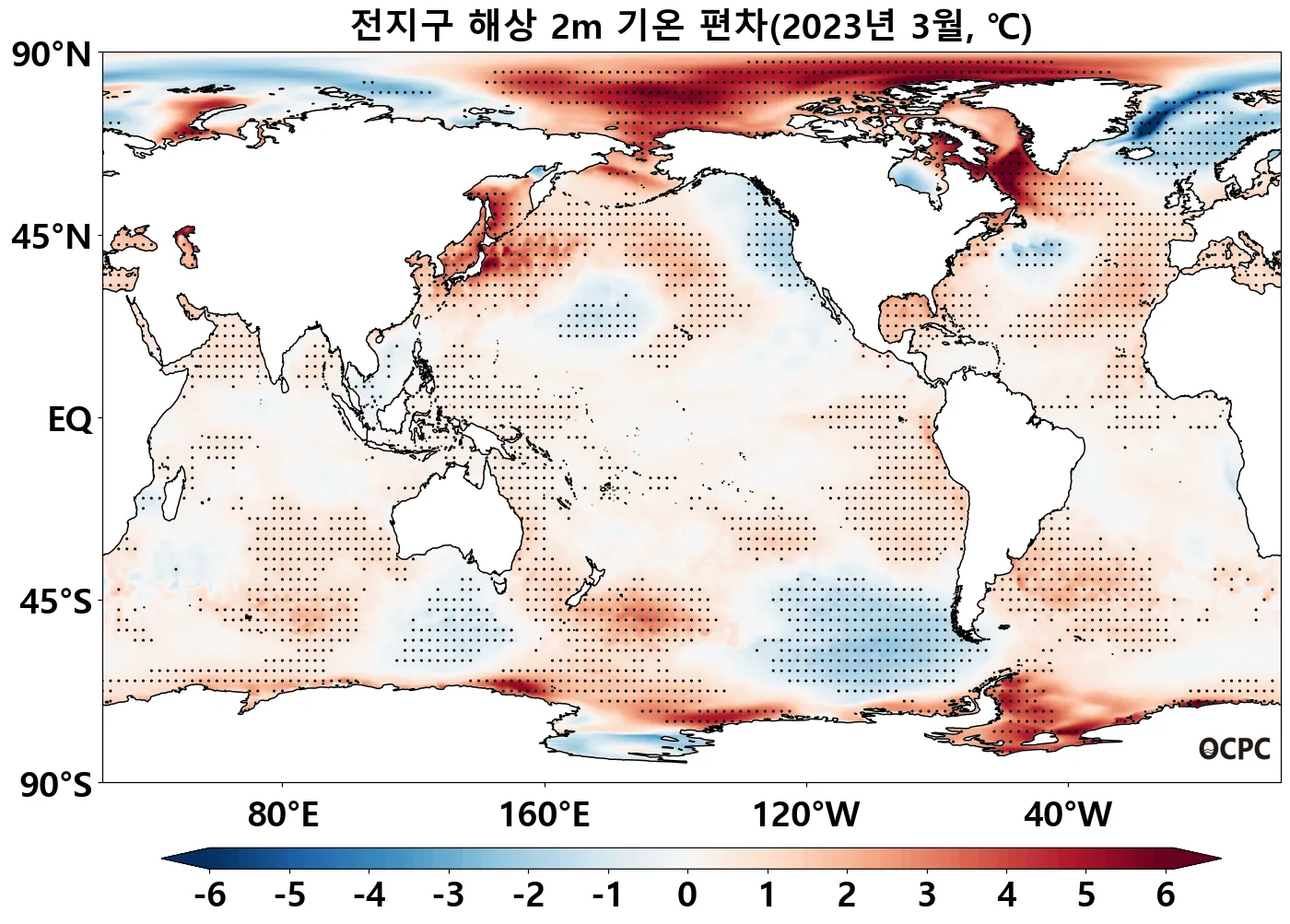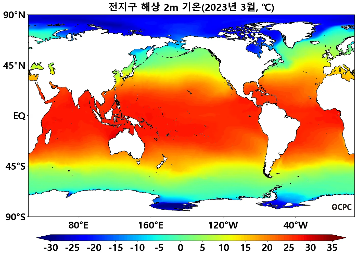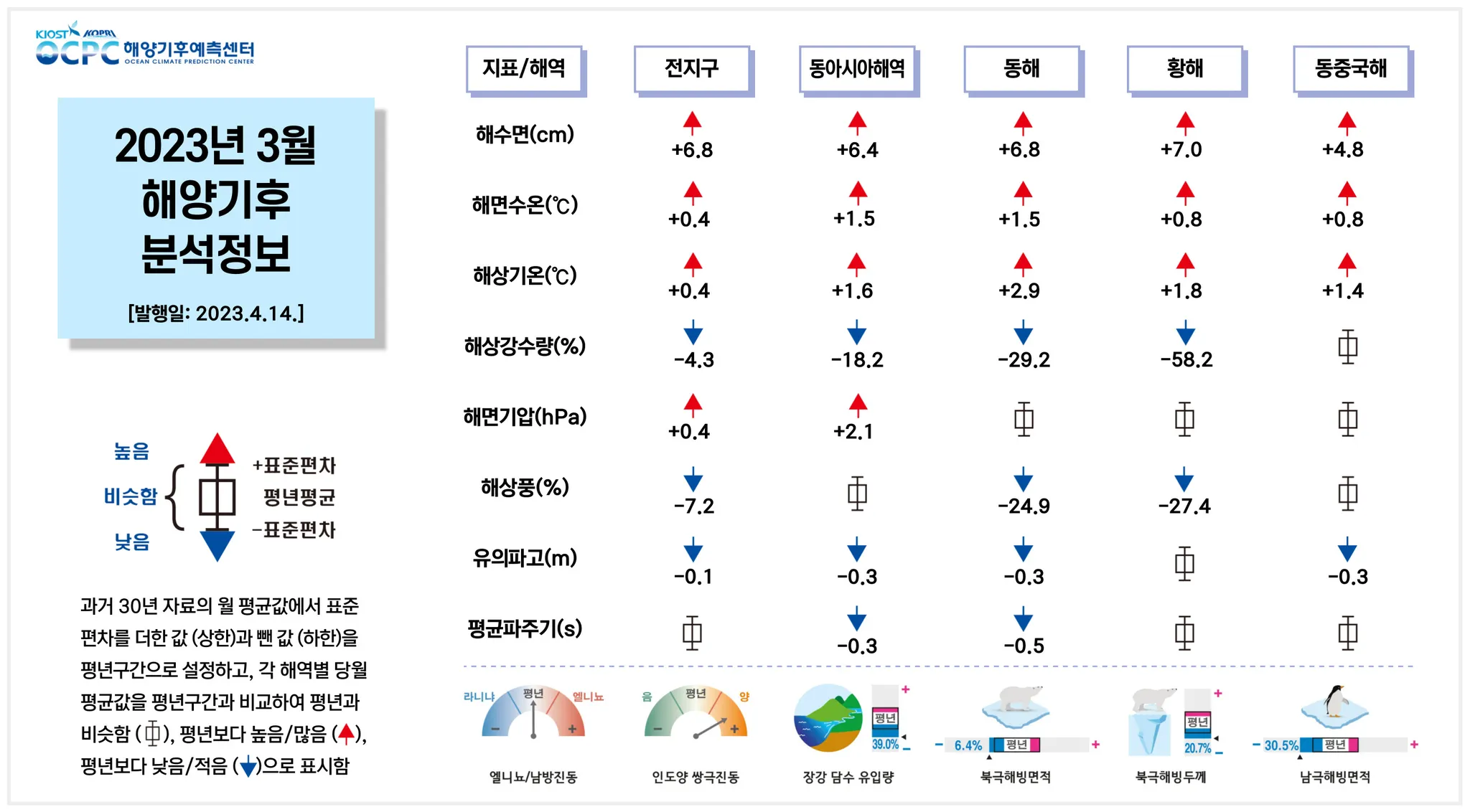 요약 : 전지구 해수면과 해면수온, 동아시아해역, 동해 해면수온과 해상기온은 역대 3월 중 가장 높았으며, 남극 해빙 면적은 역대 3월 중 2번째로 작았습니다.