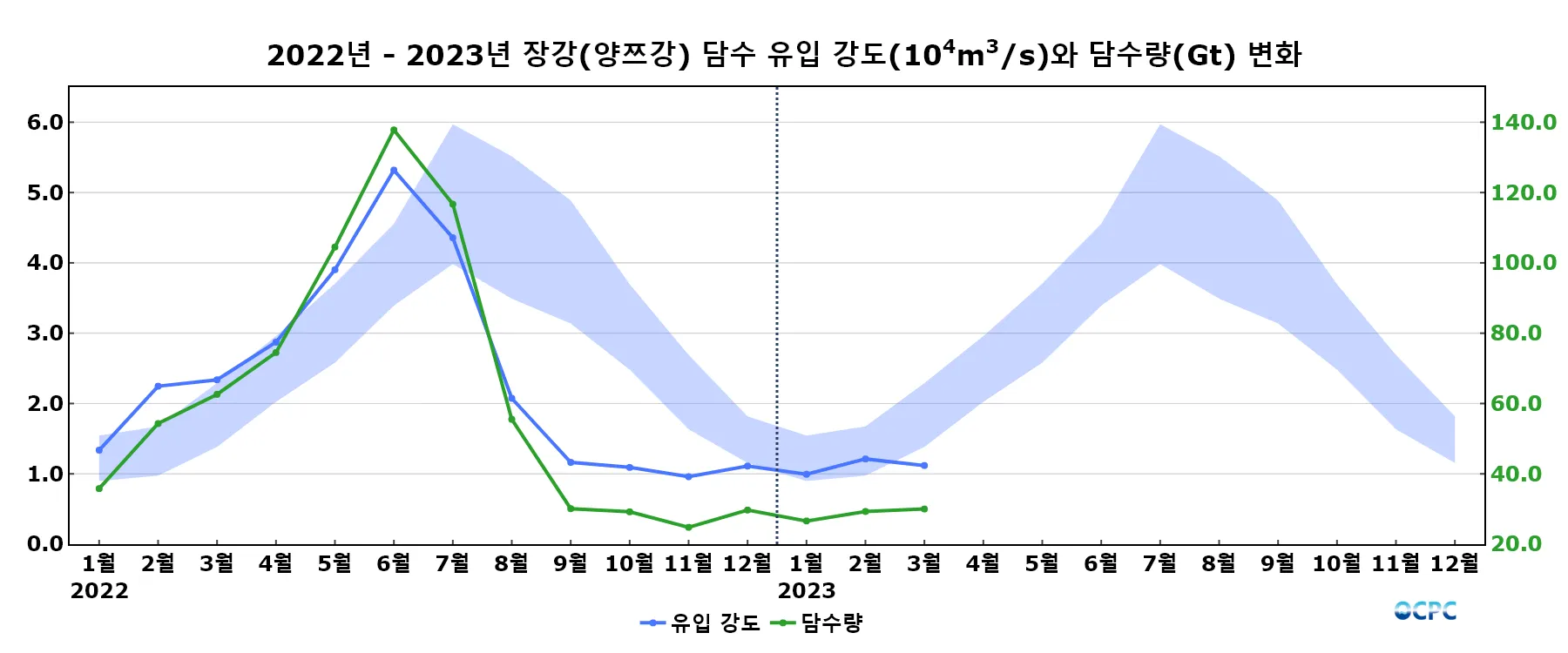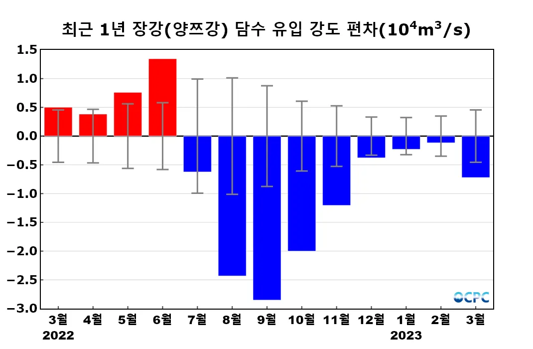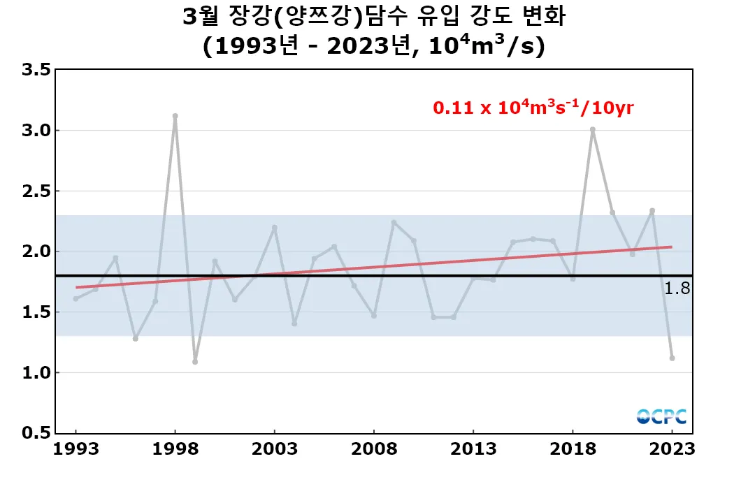1993~2023년 동안 3월 장강 담수 유입 강도는 10년에 초당 1,100톤(한 달 동안 유입된 담수량으로 환산하면 10년에 2.9기가톤)씩 증가하는 추세이지만 2023년 3월은 관측기간(1981년 ~ 2023년) 중 4번째로 낮은 수치를 기록하고 있습니다.
