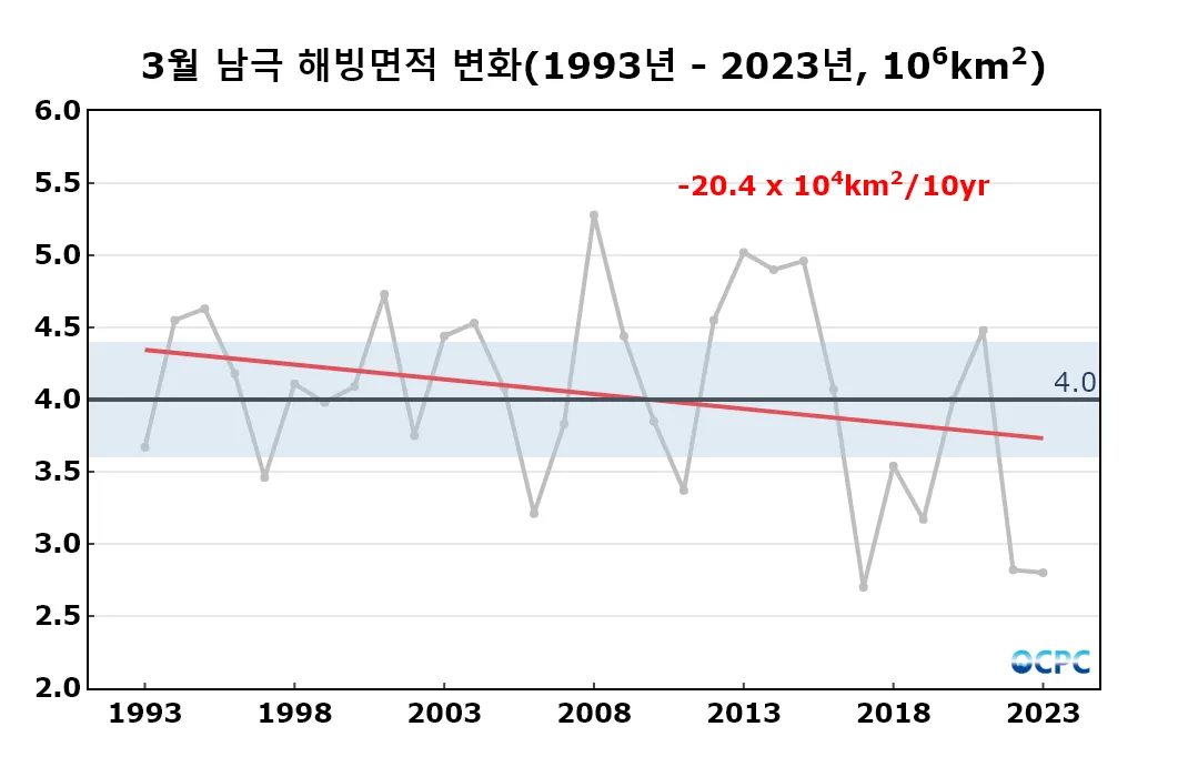 1993~2023년 동안 3월 남극 해빙면적은 10년에 20.4만km²씩 감소하는 추세입니다.