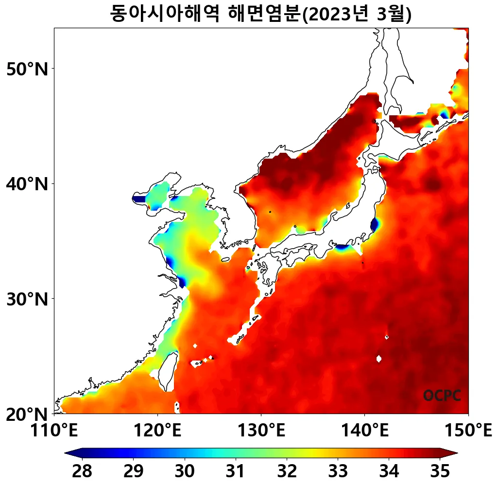 동해와 동중국해 해면염분은 자료기간 평균(34.2±0.1, 33.5±0.2)과 비슷했으며, 황해 해면염분은 자료기간 평균(32.3±0.4)보다 0.7 낮았습니다.