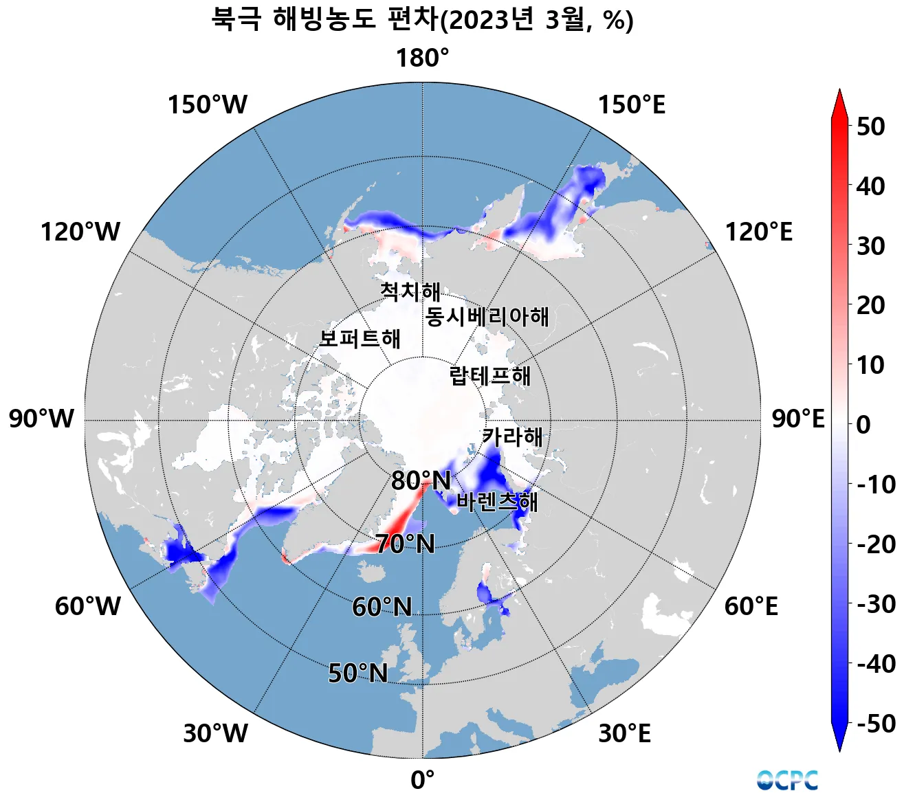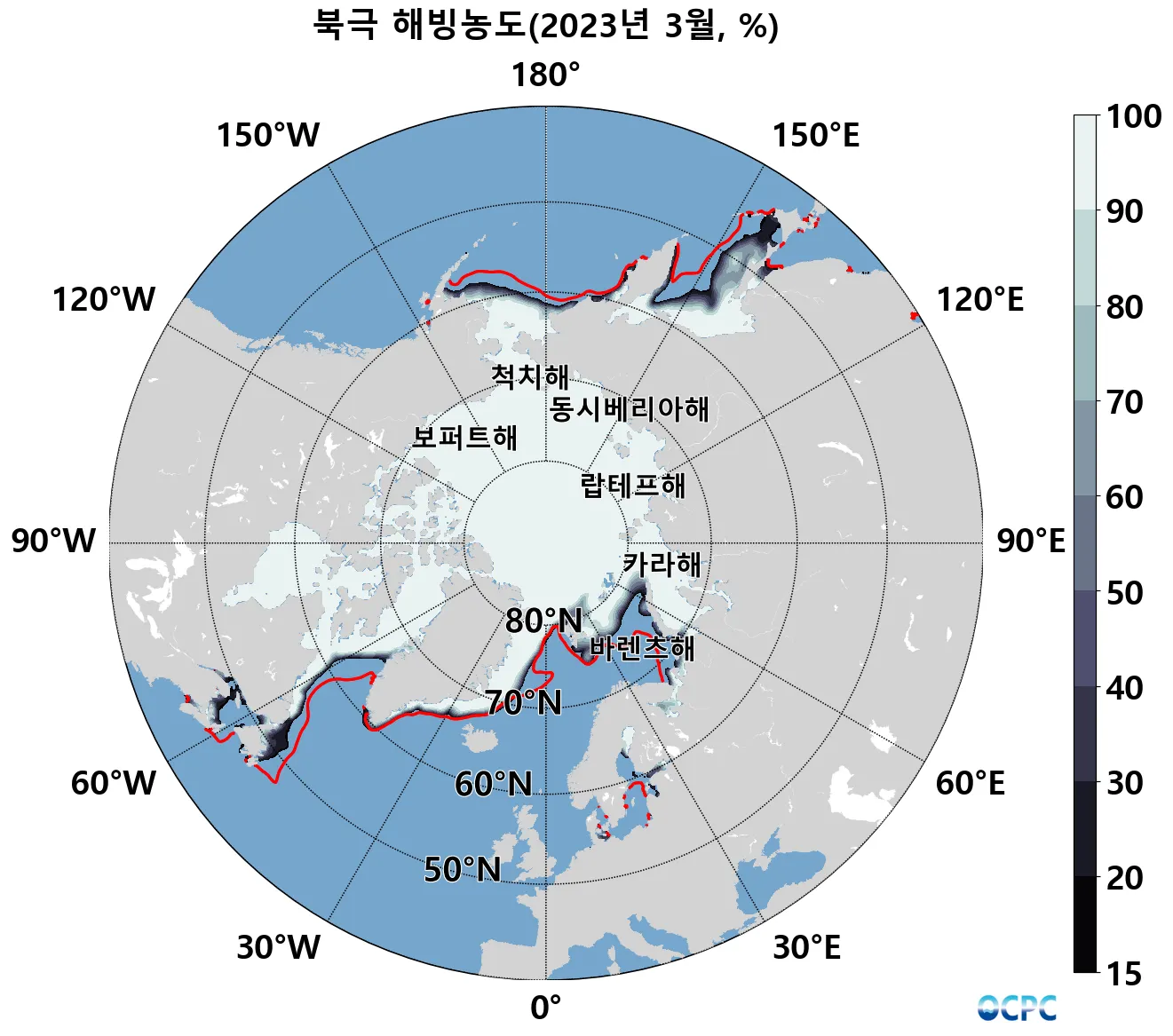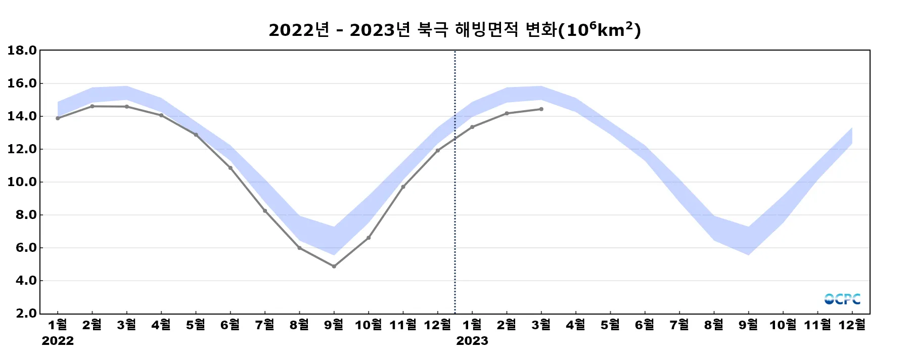 북극 해빙면적은 1,444만km²로 평년(1,543만±42만km²)보다 99만km²(6.4%) 작았고, 1981~2023년(3월)중 역대 최소였던 2017년보다 15만km² 컸습니다.