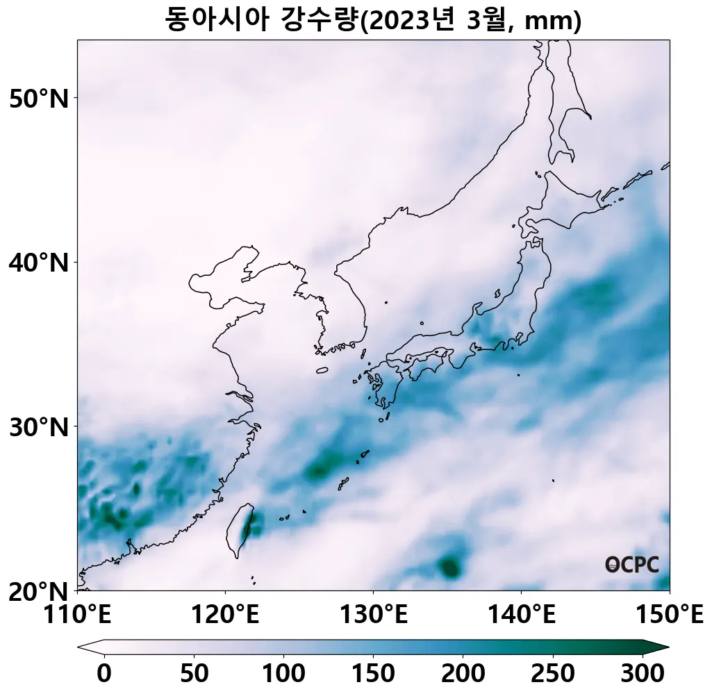 1993~2023년 동안 전지구 평균 3월 해상강수량은 10년에 1.2mm씩 증가하는 추세이며, 동아시아해역은 10년에 0.8mm씩 감소하는 추세입니다.