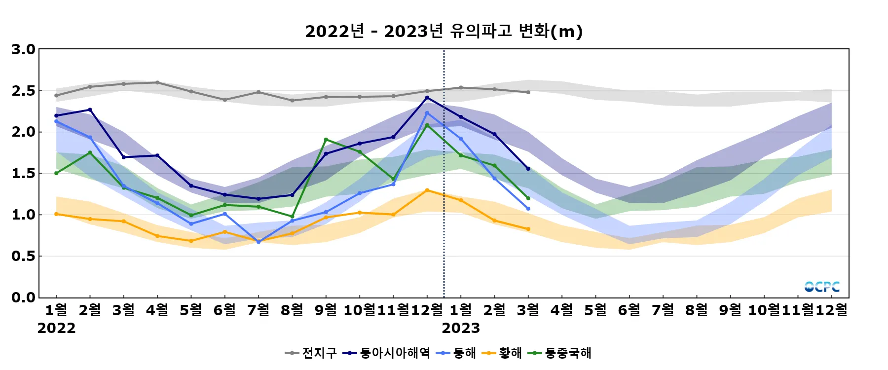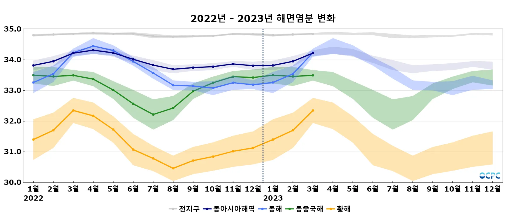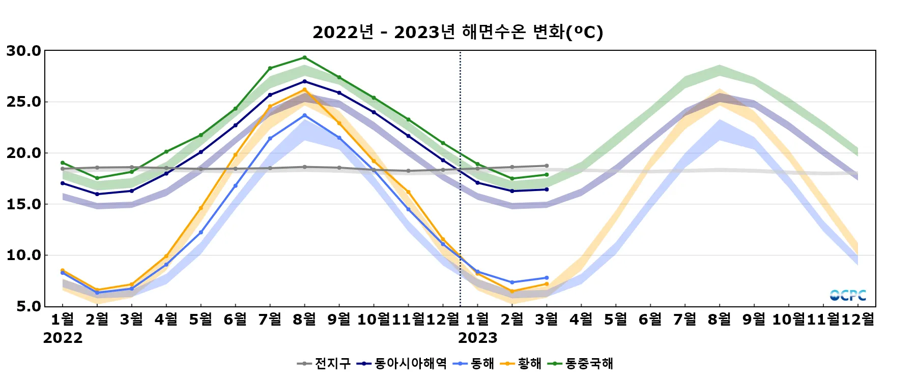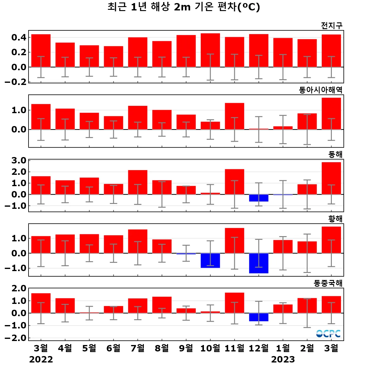 동해는 평년(6.3±0.4°C)보다 1.5°C 높아 1982~2023년(3월) 중 가장 높았으며, 황해는 평년(6.4±0.6°C)보다 0.8°C 높았고, 동중국해는 평년(17.1±0.5°C)보다 0.8°C 높았습니다.