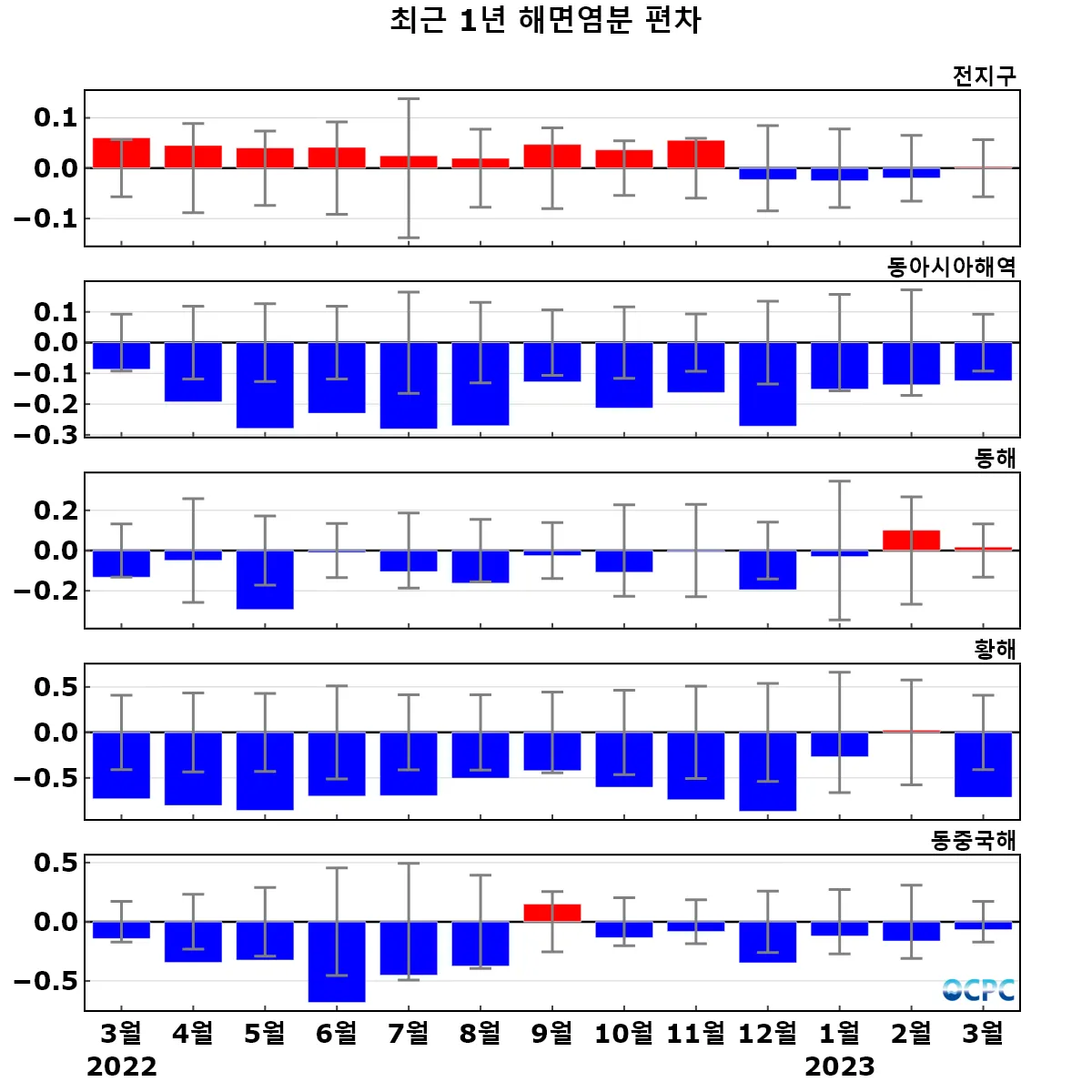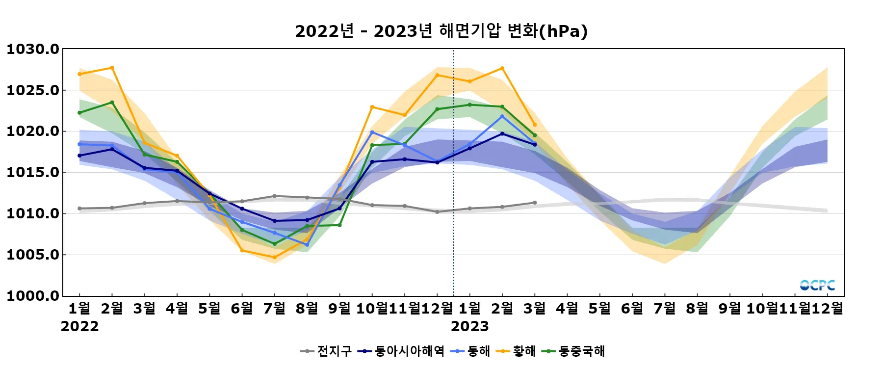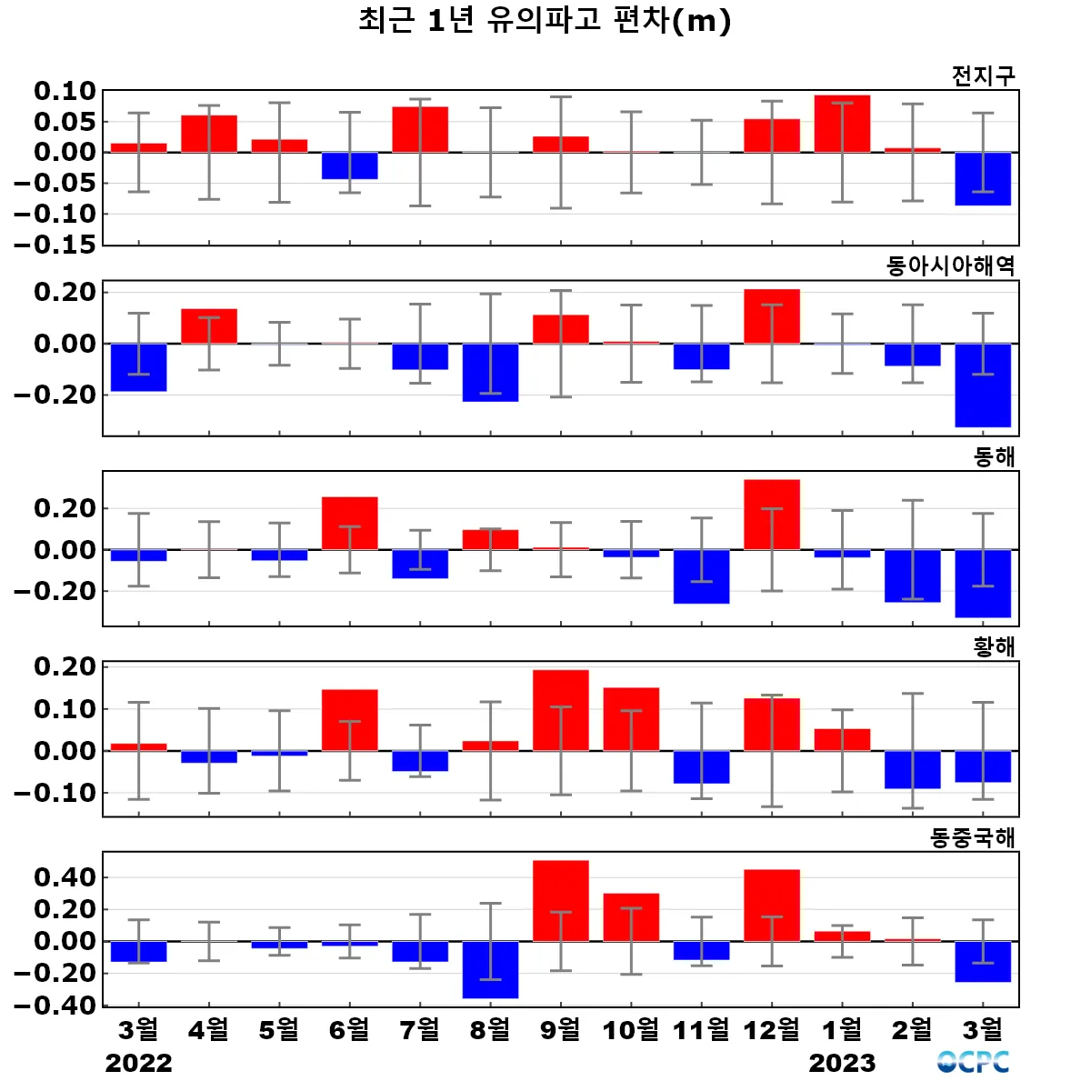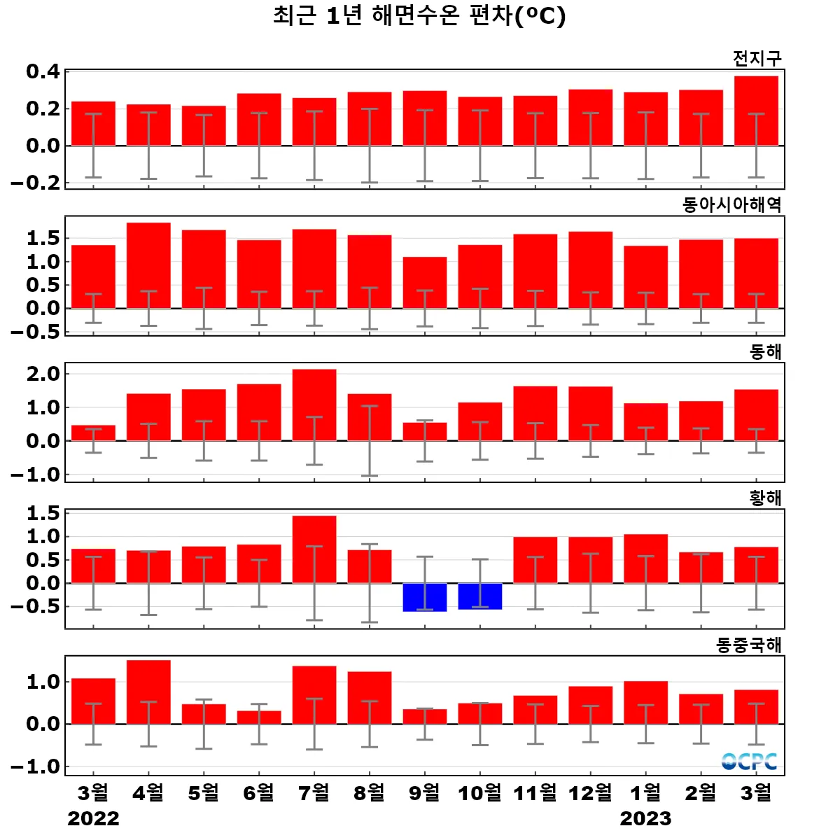 동해는 평년(6.3±0.4°C)보다 1.5°C 높아 1982~2023년(3월) 중 가장 높았으며, 황해는 평년(6.4±0.6°C)보다 0.8°C 높았고, 동중국해는 평년(17.1±0.5°C)보다 0.8°C 높았습니다.