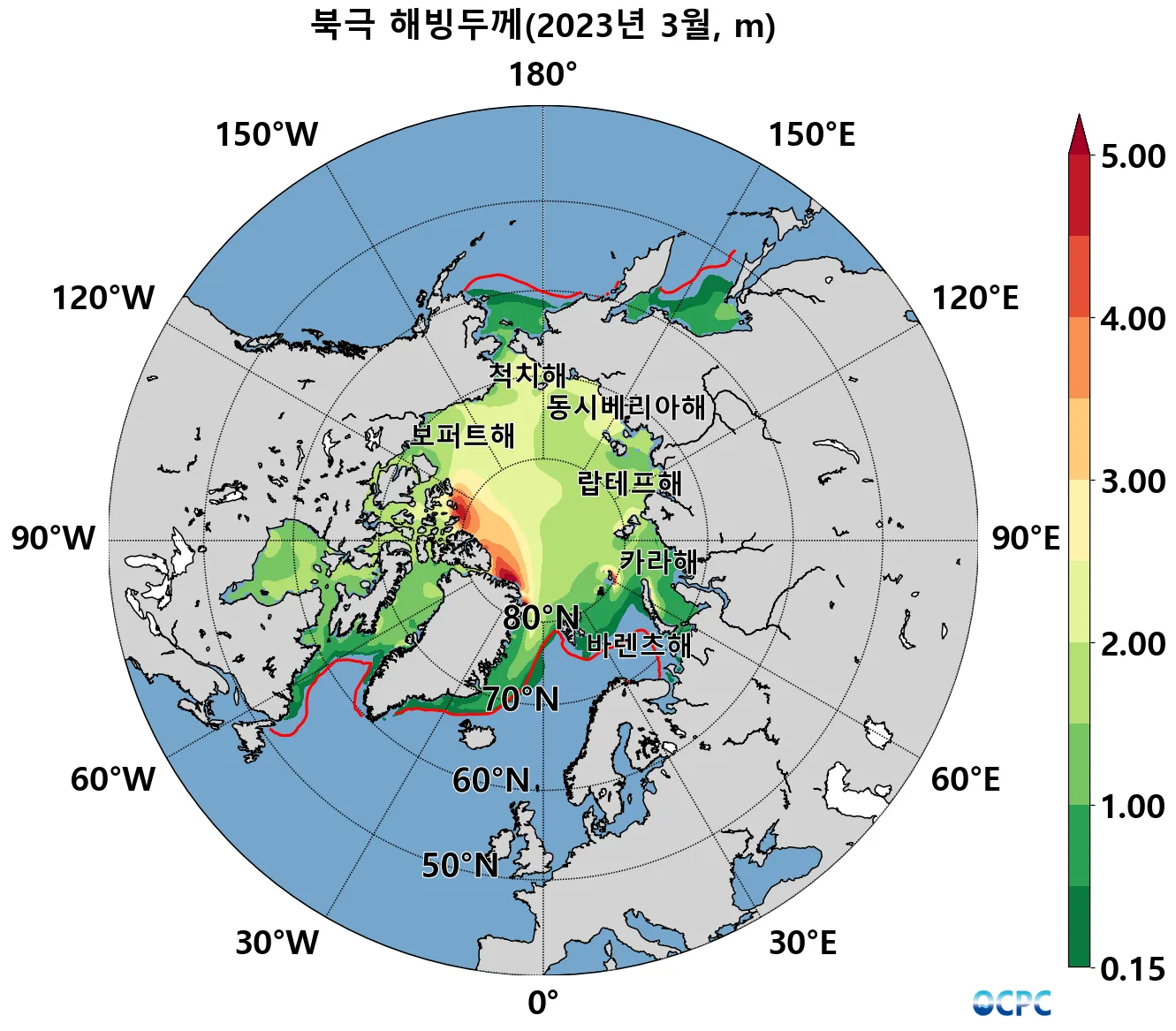 해빙두께 0.15m 이상 해역, 붉은선(평년 해빙두께 0.15m 경계)
