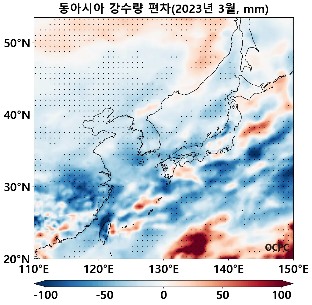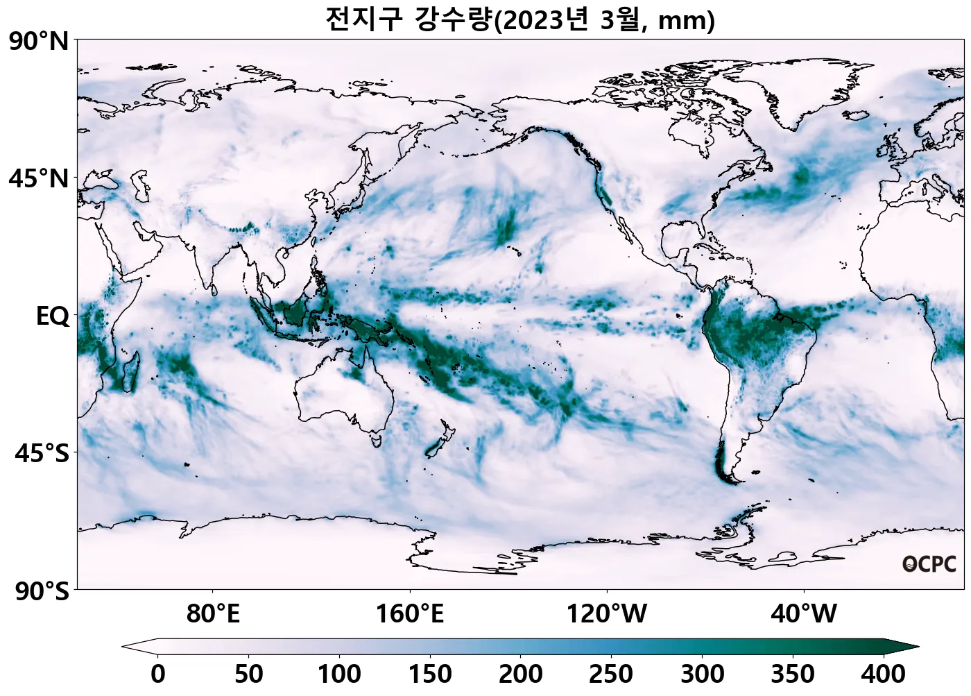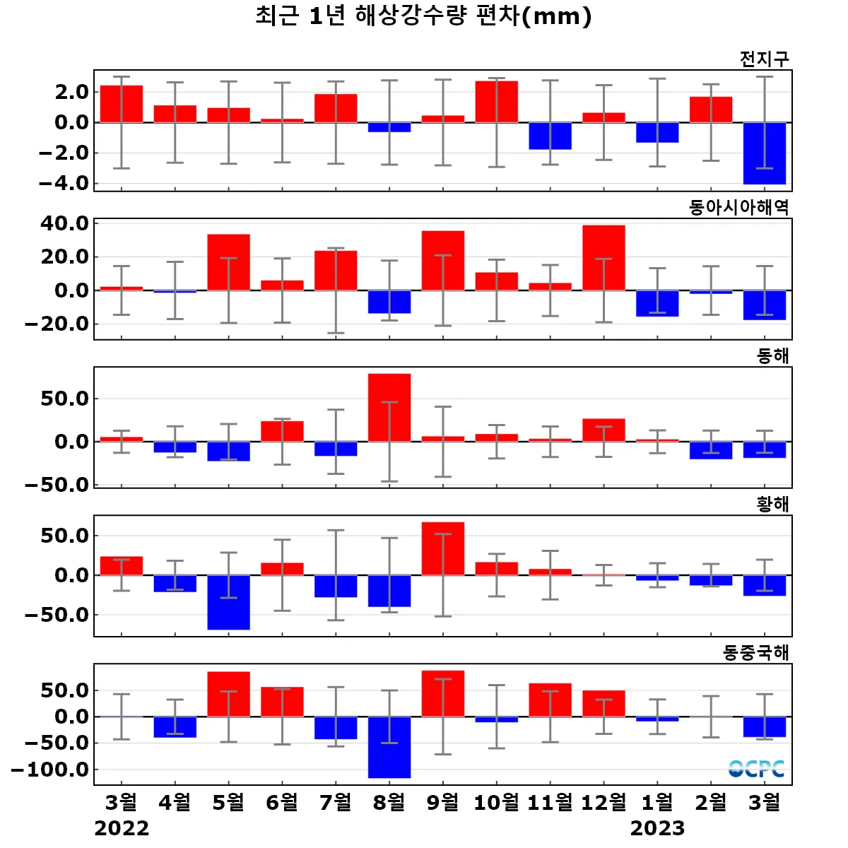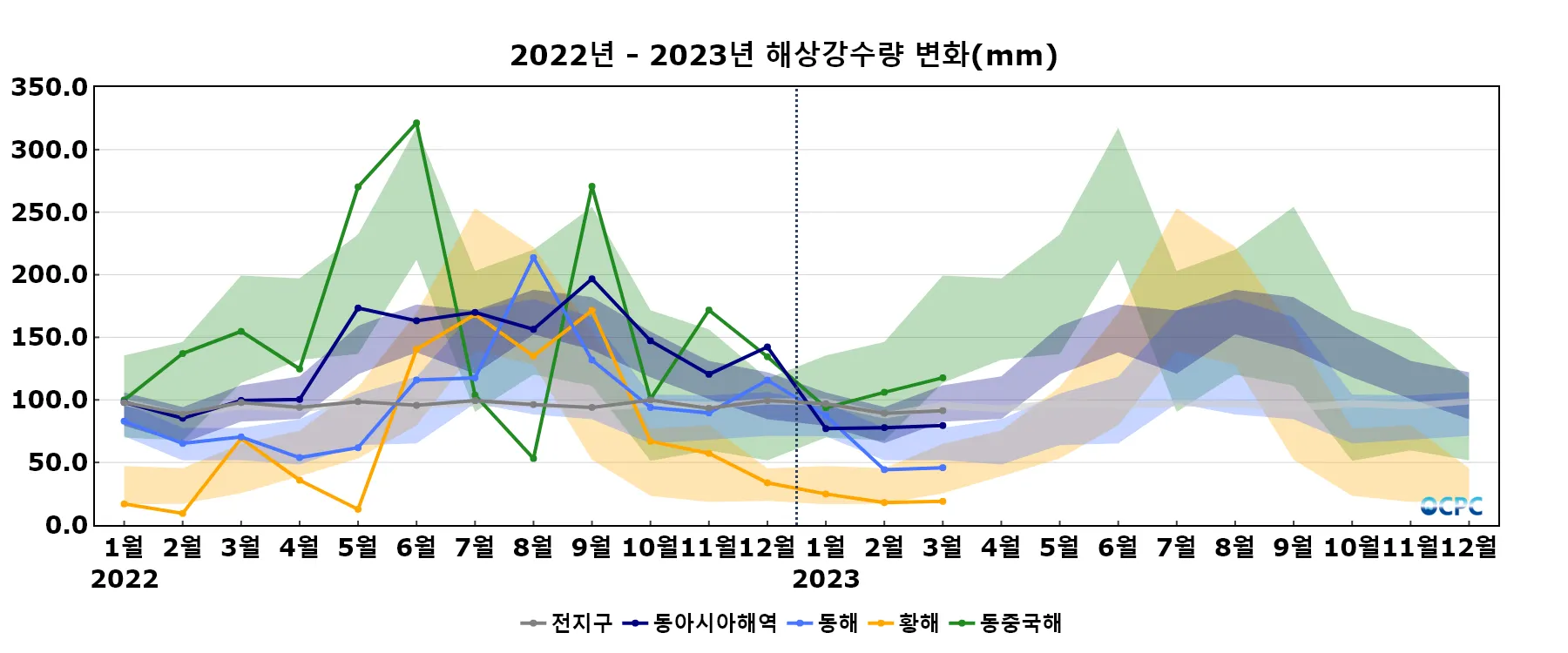 [해상강수량] 전지구, 동아시아해역, 동해, 황해의 해상강수량은 평년보다 4.3 ~ 58.2% 감소했으며, 동중국해는 평년과 비슷했습니다. 특히, 전지구는 1981~2023년(3월) 중 2번째로 적었습니다.