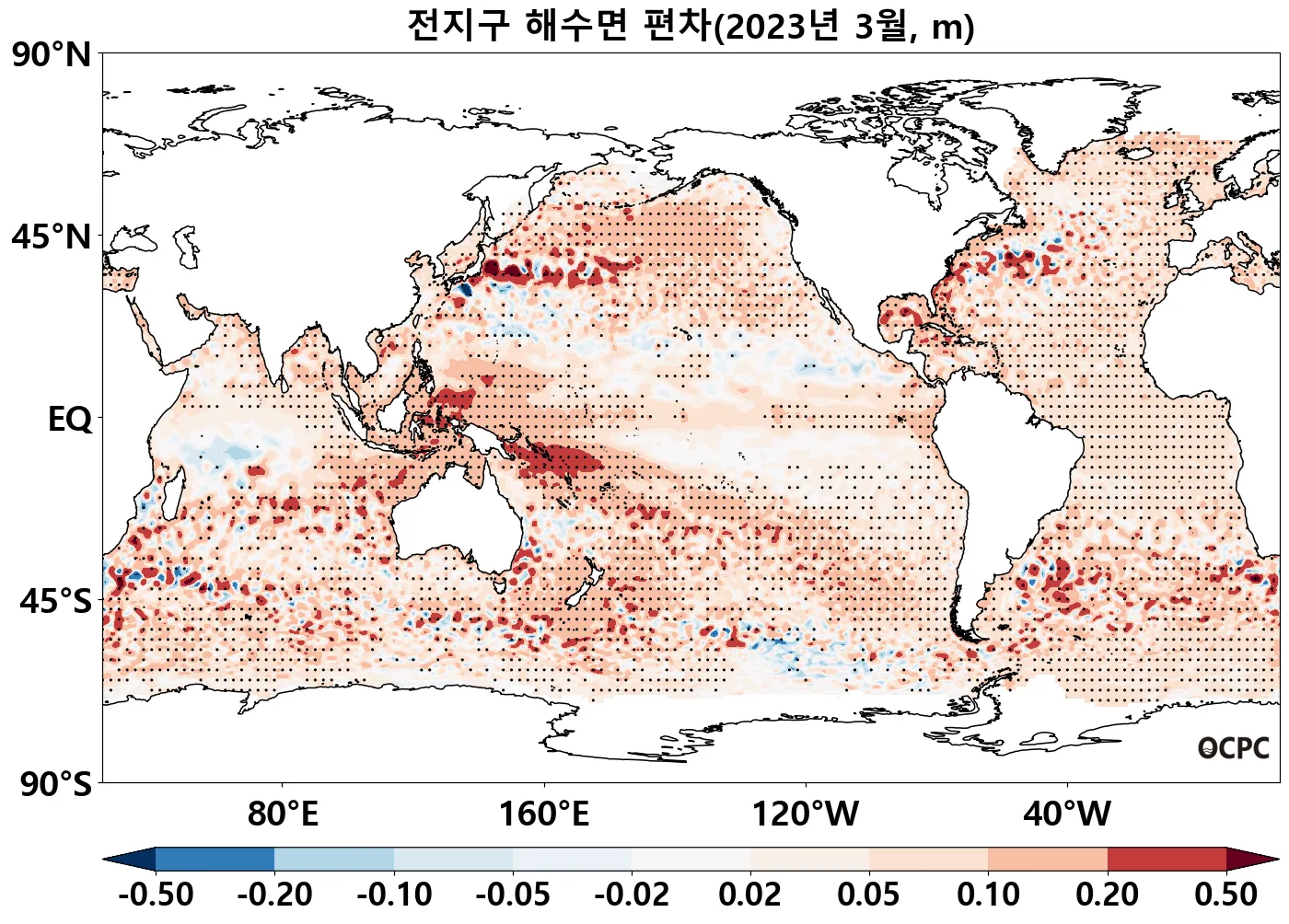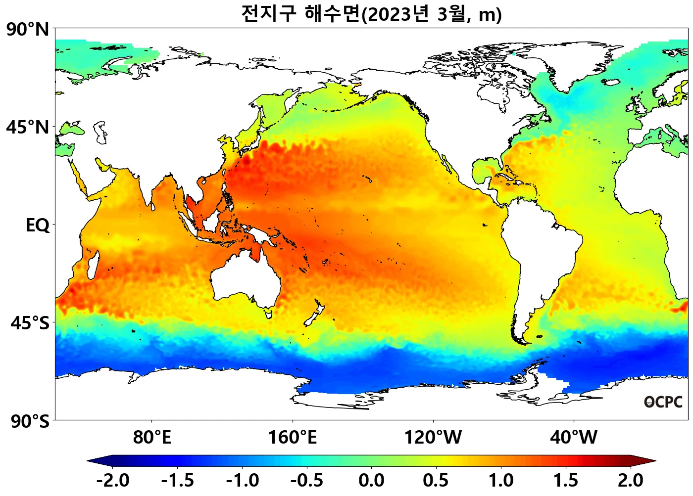 특히 인도-태평양 웜풀해역(열대 서태평양과 인도네시아 주변 해역)의 해수면이 평년보다 두드러지게 높았습니다.