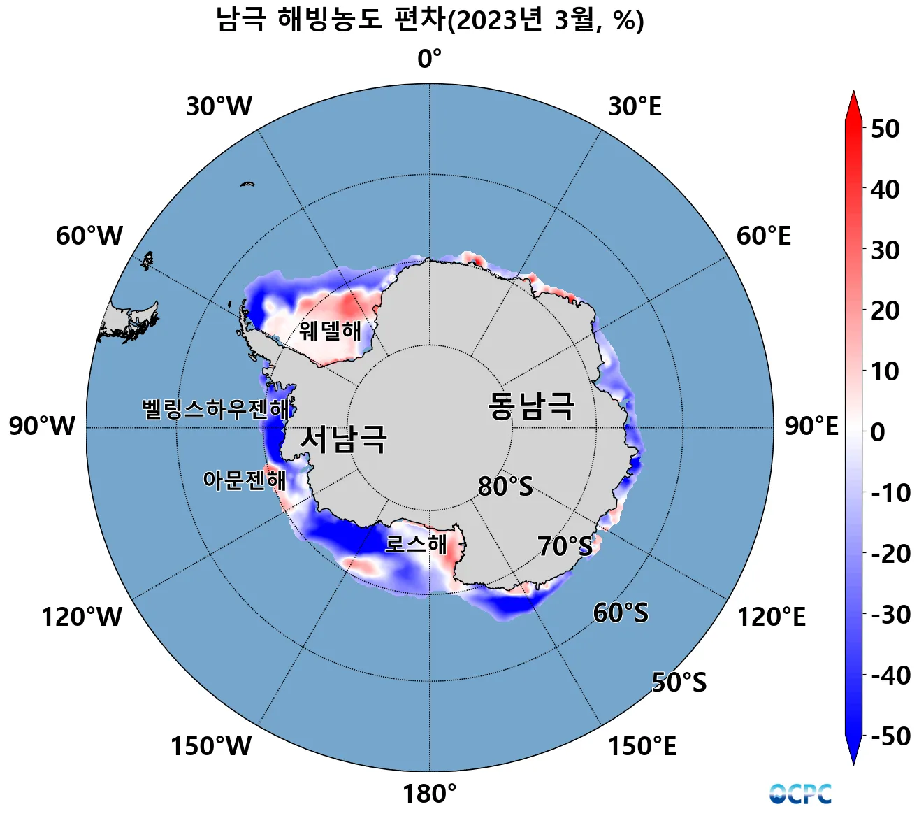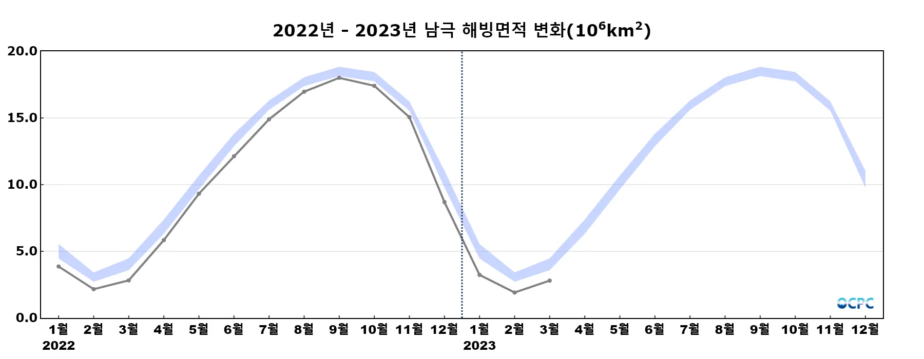 남극 해빙면적은 280만km²로 평년(403만±44만km²)보다 123만km²(30.5%) 작았고, 1981~2023년(3월)중 역대 최소였던 2017년보다 10만km² 컸습니다. 이는 위성관측 기간(1981년 ~ 2023년) 중 2번째로 작은 값입니다.