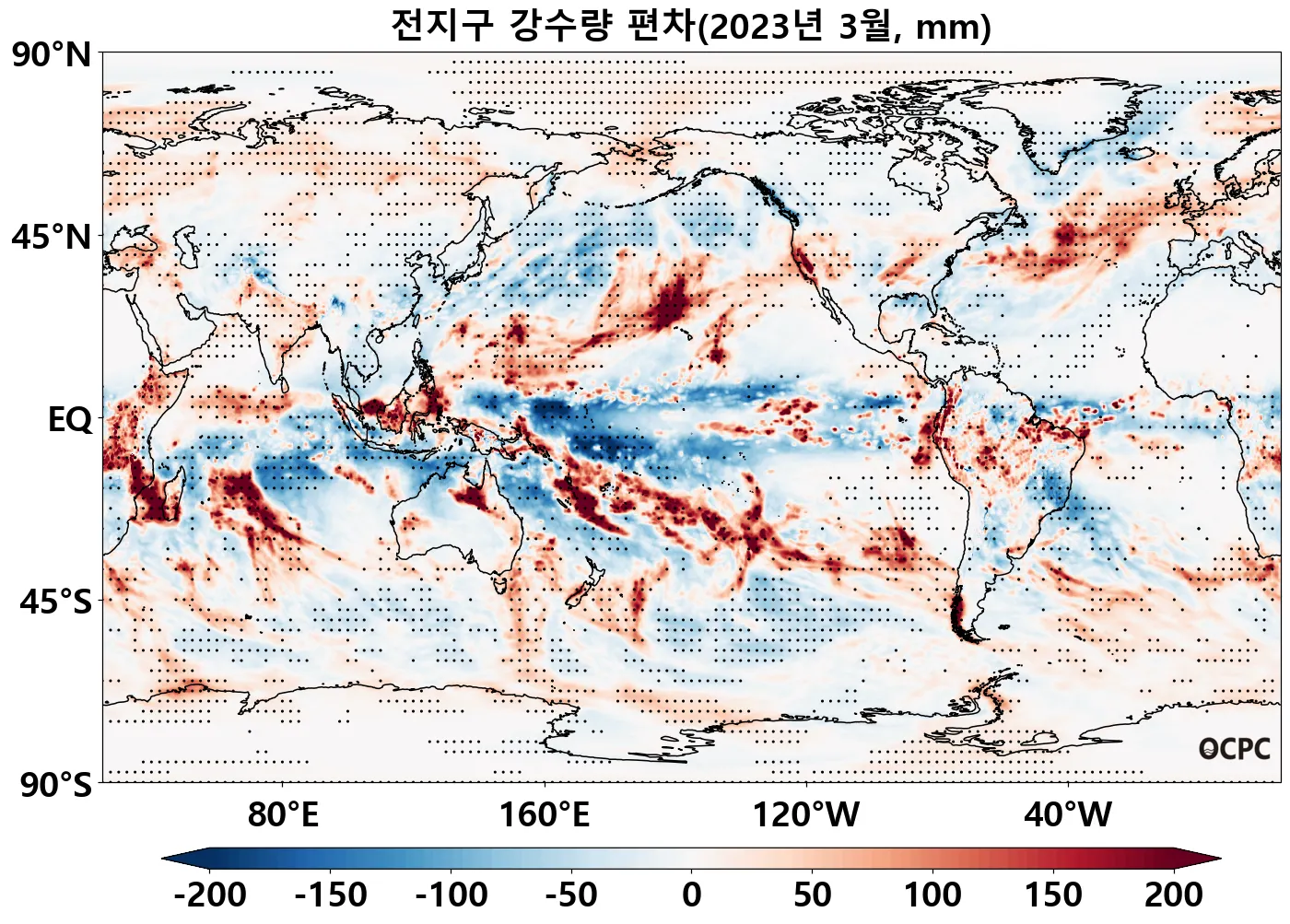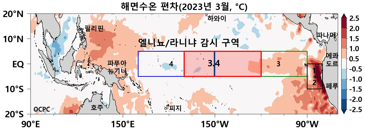 엘니뇨/라니냐 감시구역인 열대태평양 Nino3.4 해역(5°S~5°N, 170°W~120°W)의 3월 평균 해면수온 편차(0°C)는 중립에 해당합니다.