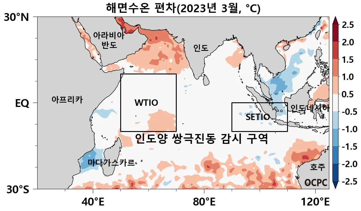 2023년 2월 평균 해면수온의 평년 대비 편차 (사각형은 인도양 쌍극진동 감시구역으로 각각 WTIO(열대서인도양), SETIO(열대 남동인도양) 해역이며, 인도양 쌍극진동 지수(DMI: Dipole Mode Index)는 WTIO의 평년 대비 편차에서 SETIO의 평년 대비 편차를 뺀 값입니다.)