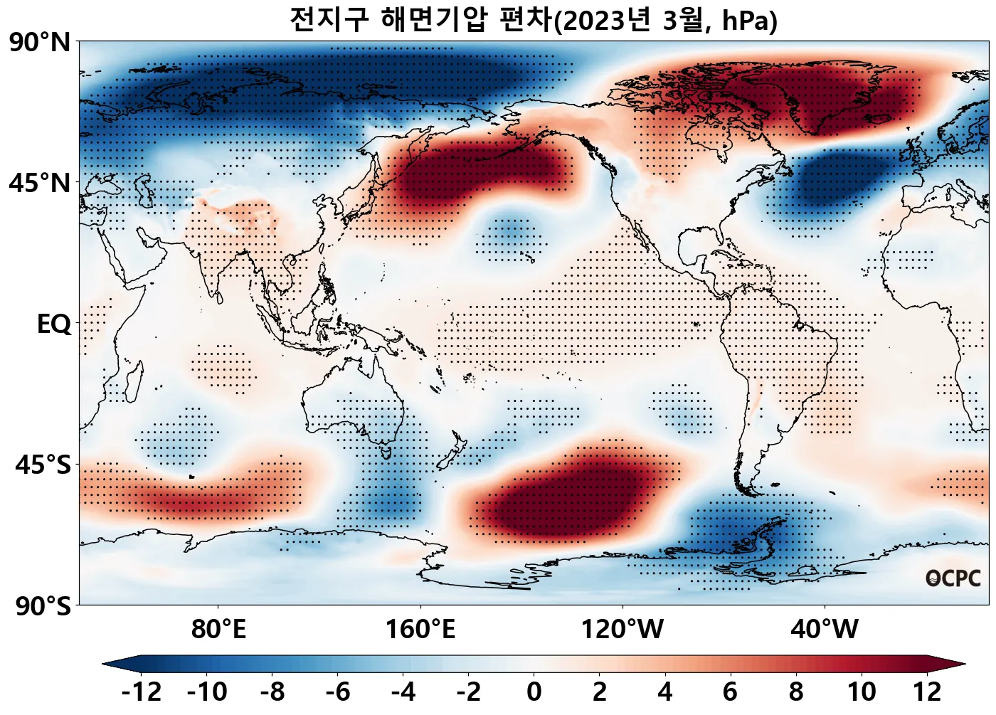 북태평양과 북미대륙의 해면기압은 평년보다 높았으며, 북극해와 북대서양은 평년보다 낮았습니다.