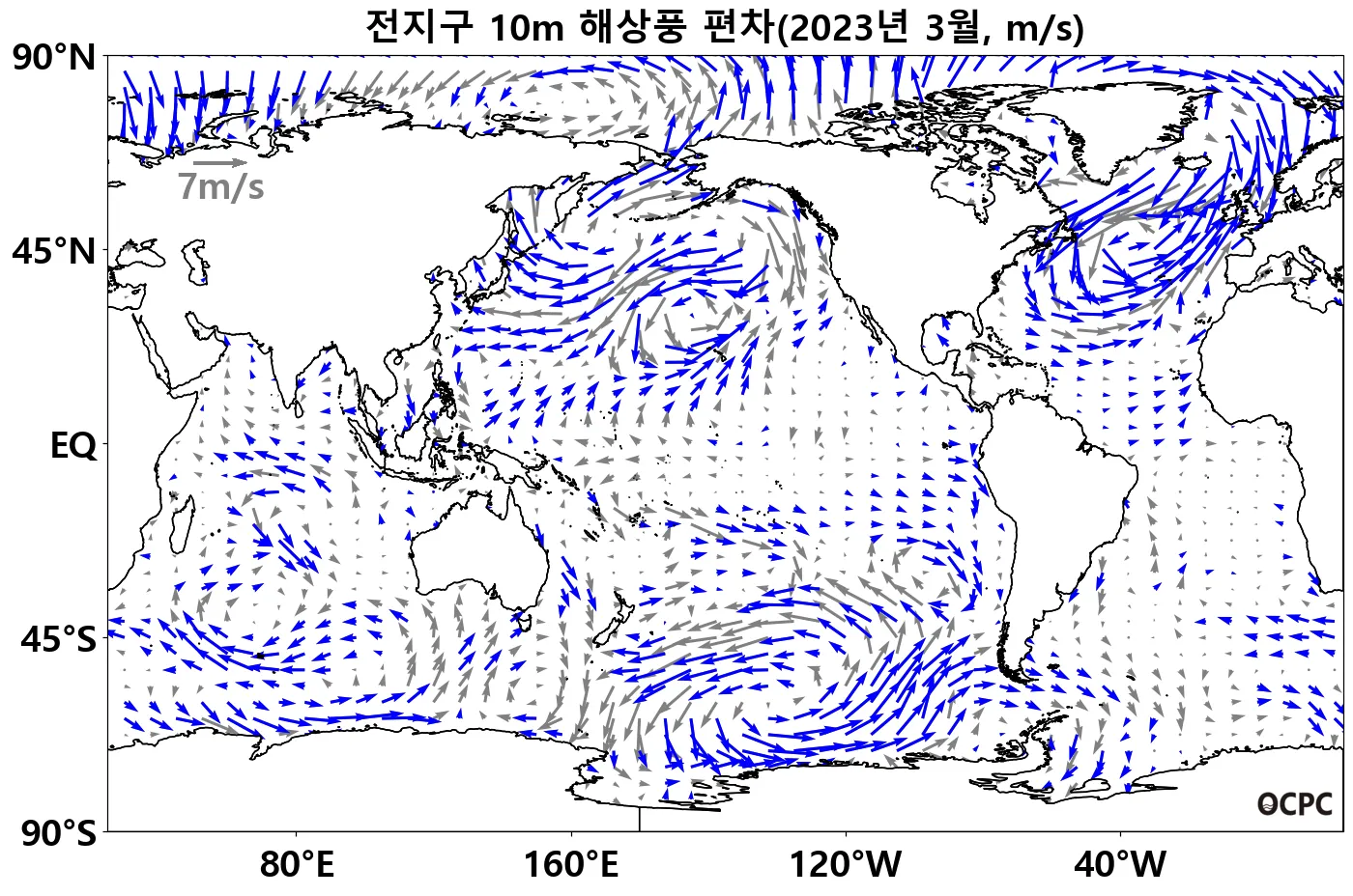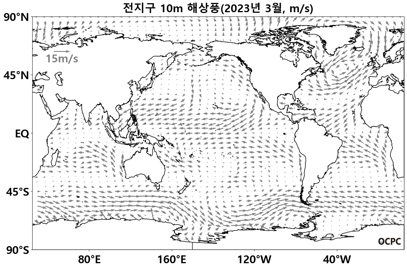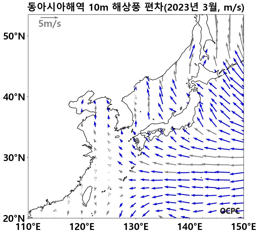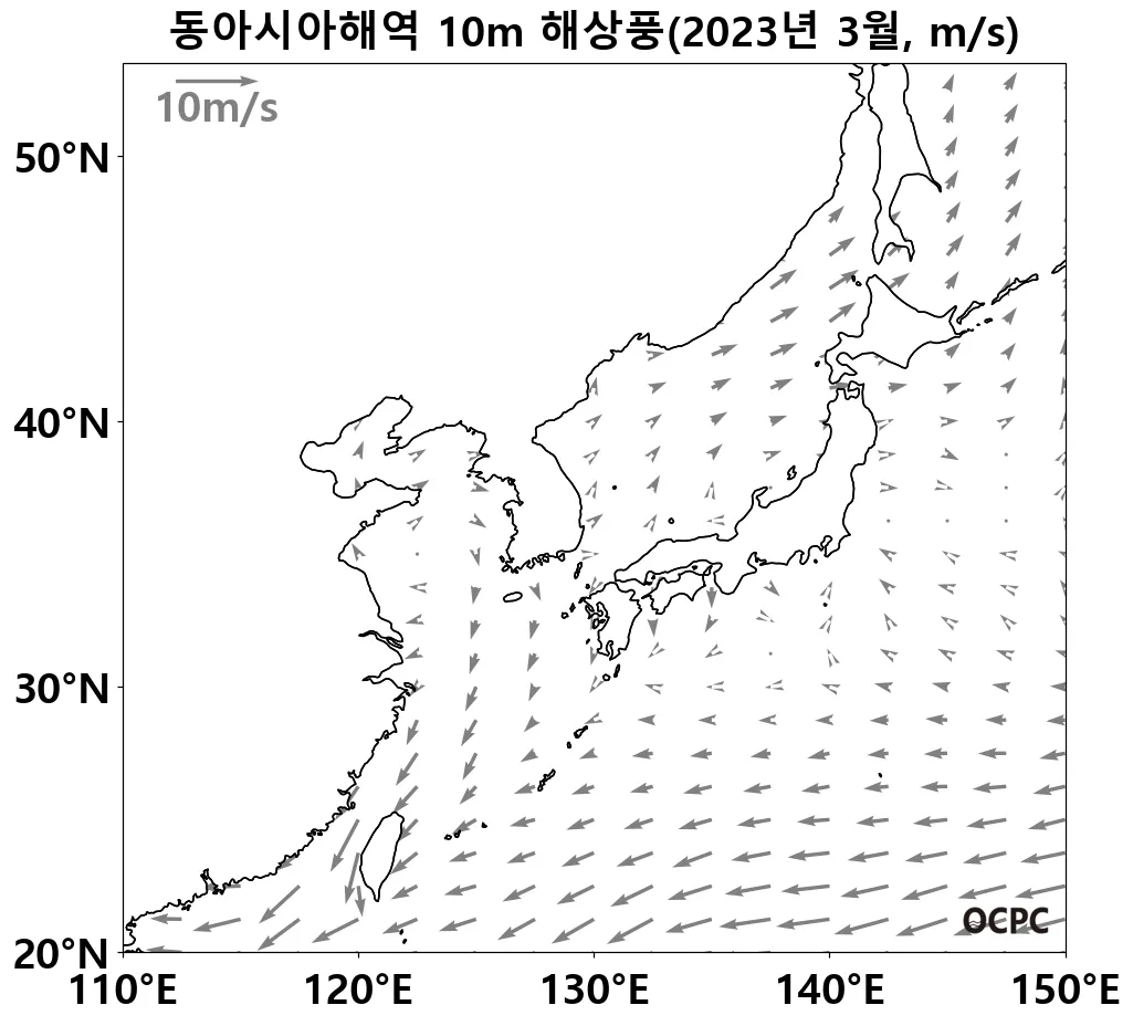 1993~2023년 동안 전지구의 3월 해상풍속은 10년에 0.1m/s씩 증가하고 동아시아해역은 0.1m/s씩 감소하는 추세입니다.