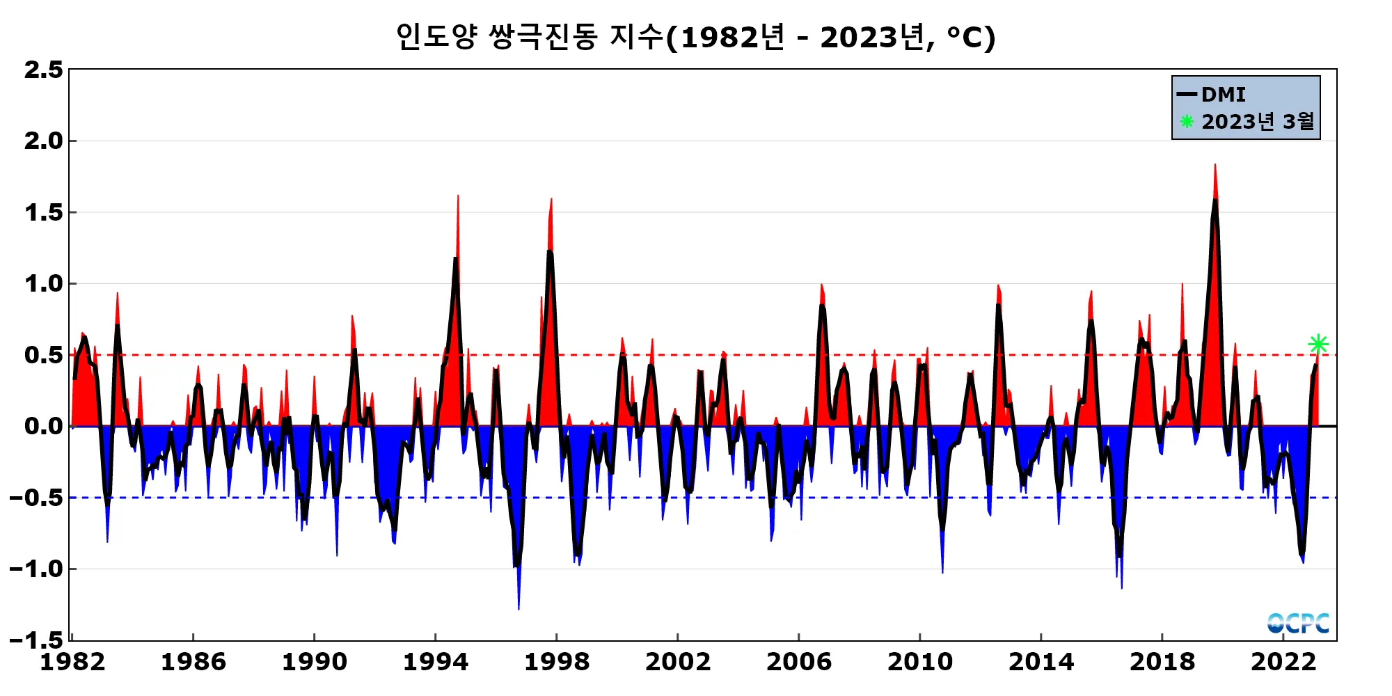 인도양 쌍극진동 지수 DMI (Dipole Mode Index)는 WTIO의 평년 대비 편차에서 SETIO의 평년 대비 편차를 뺀 값으로 월 평균 지수(채색부분)를 3개월 이동평균하여 나타낸 지수(검정선)가 0.5보다 크면 양의 상태로, -0.5보다 작으면 음의 상태로 판정합니다. OCPC 월간 분석정보에서는 당월 평균 지수만을 이용해서 잠정적으로 판정합니다.