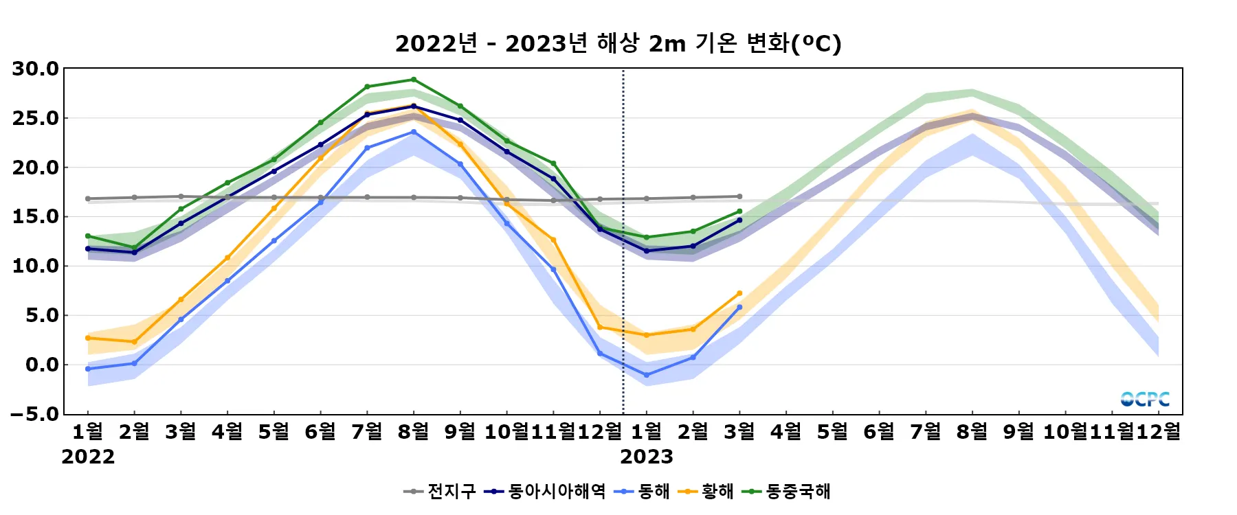 동해, 황해의 해상기온은 평년(3.0±0.8°C, 5.5±0.9°C)보다 각각 2.9°C, 1.8°C 상승했으며, 동중국해는 평년(14.2±0.8°C)보다 1.4°C 높았습니다.