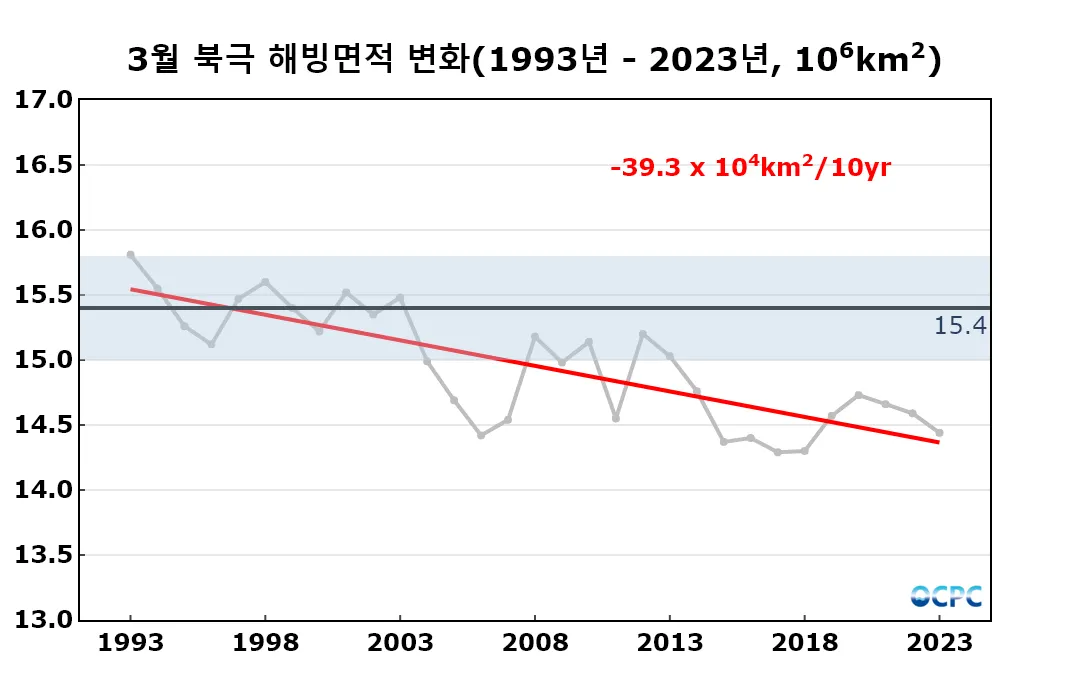 1993~2023년 동안 3월 북극 해빙면적은 10년에 39.3만km²씩 감소하는 추세입니다.