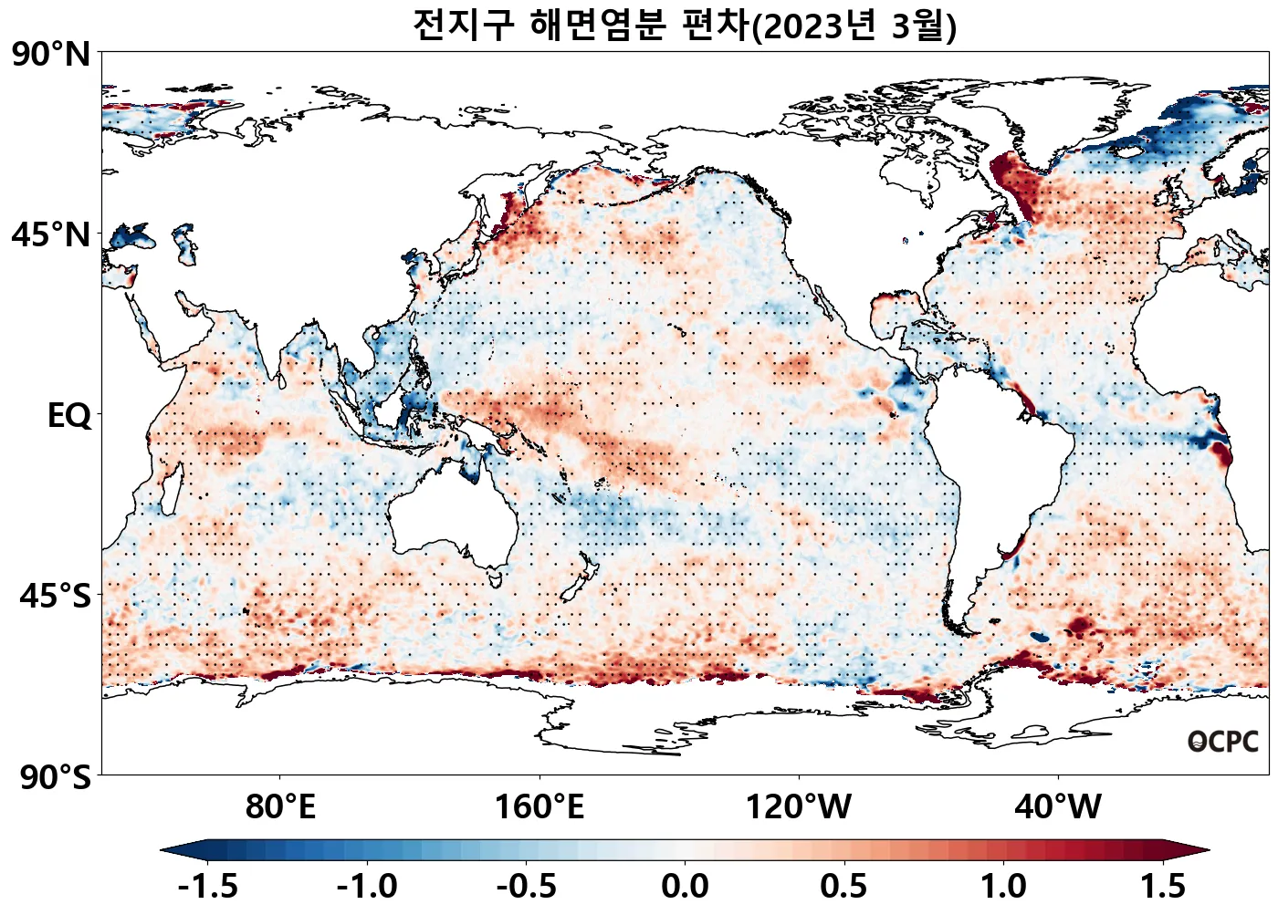 인공위성(SMAP)을 이용한 해면염분 추정 자료는 2015년 4월부터 활용가능하나 기간이 짧고 다른 자료에 비해서 불확실성이 큽니다. 2023년부터는 8년 정도의 자료가 확보되는 시점이어서 기간 평균 대비 월별 편차를 시범적으로 제공하오니 참고하시기 바랍니다.