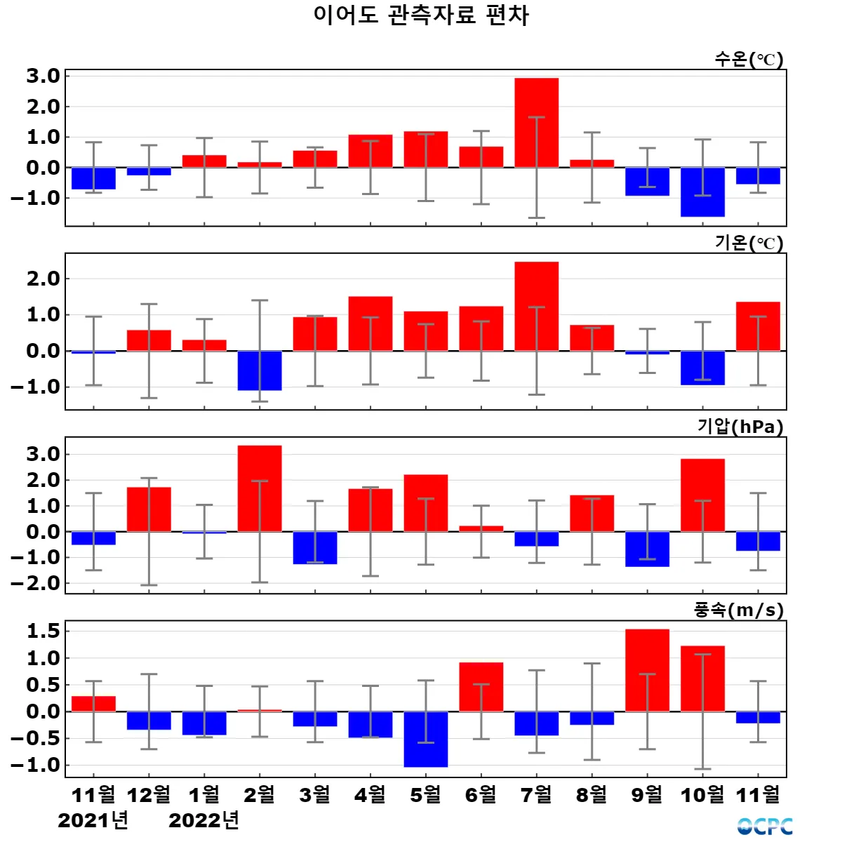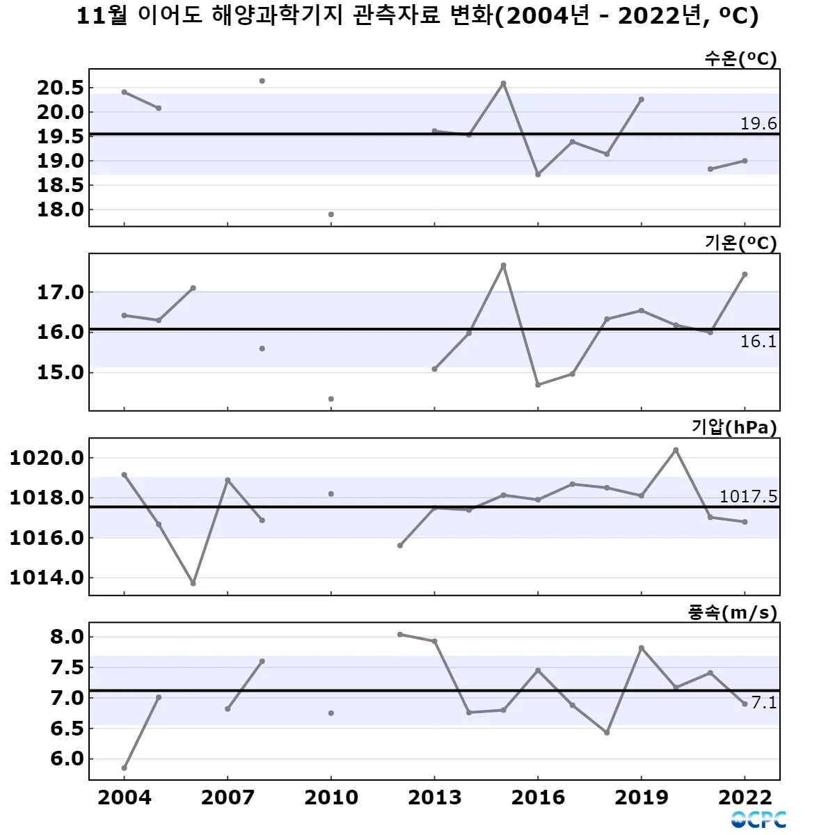 이어도 기지 관측기간 중 11월 평균 기온은 2015년(17.7℃ )에 이어 2022년(17.4℃)에 두번째로 높았으며, 전반적으로 수온, 기압, 풍속은 평년과 유사하였습니다.