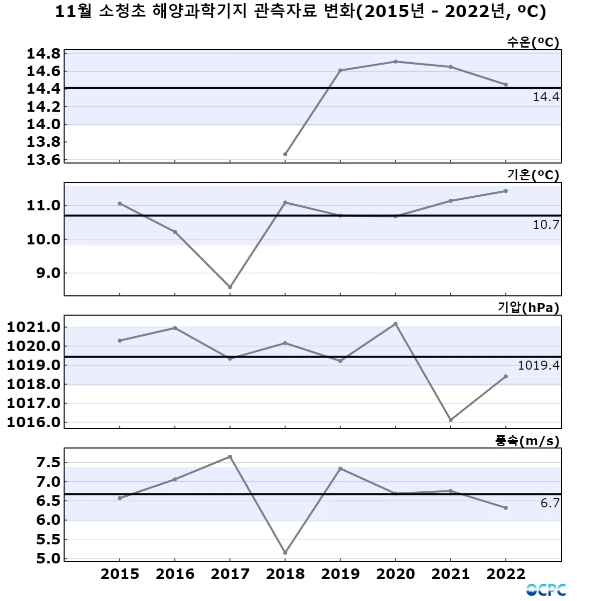 관측기간(2019~2022년, 4년) 11월 평균 수온(3m)은 14.4℃, 8년(2015~2022년) 평균 기온(해상 39.5m)은 10.7℃, 기압은 1019.4hPa, 풍속은 6.7m/s입니다.