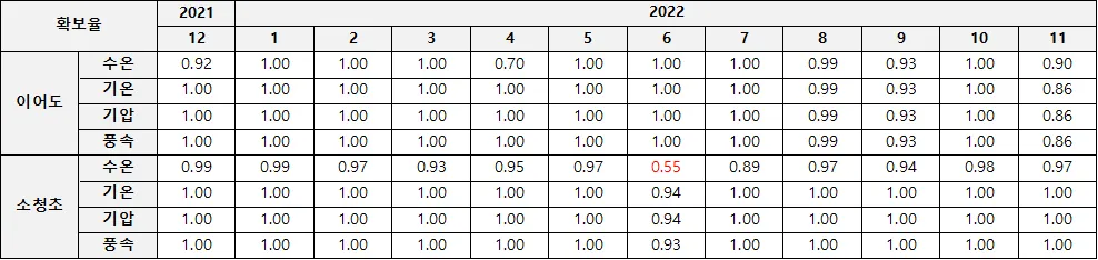해양과학기지 관측요소별 관측자료 월별 확보율(2021-2022). 최대가 1.0이며 붉은색은 월 확보율 0.8(수온은 0.7) 미만인 자료로 분석에서 제외