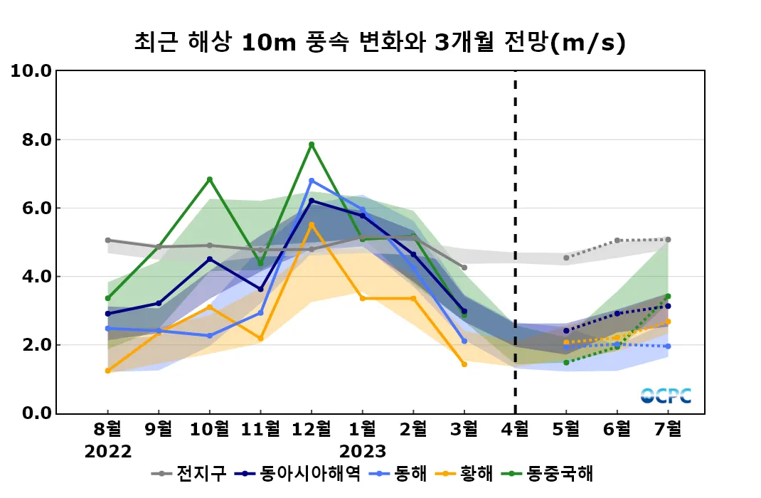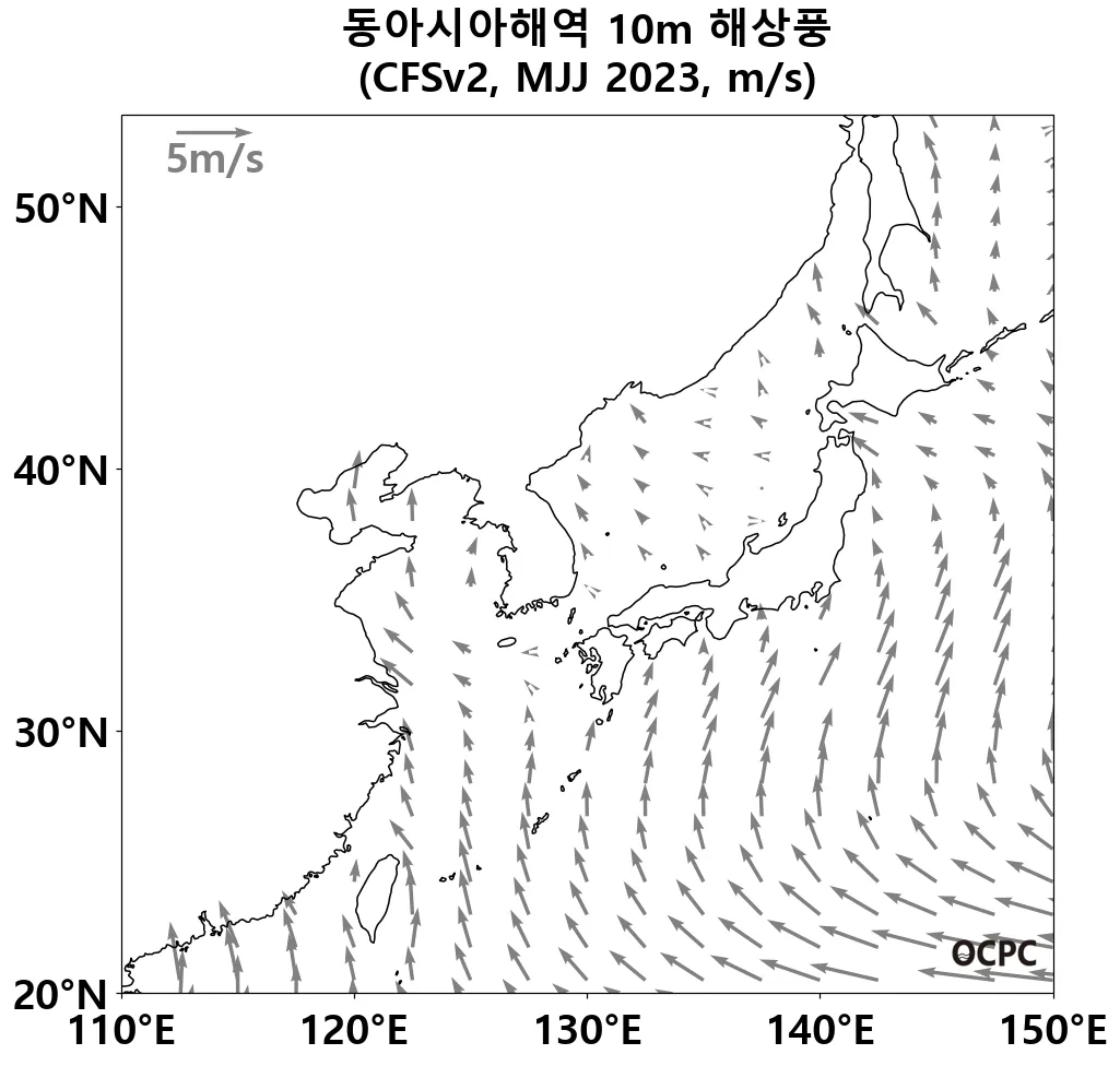 동아시아해역의 5~7월 평균 해상풍속은 평년(2.6±0.4m/s)과 비슷하겠습니다.
