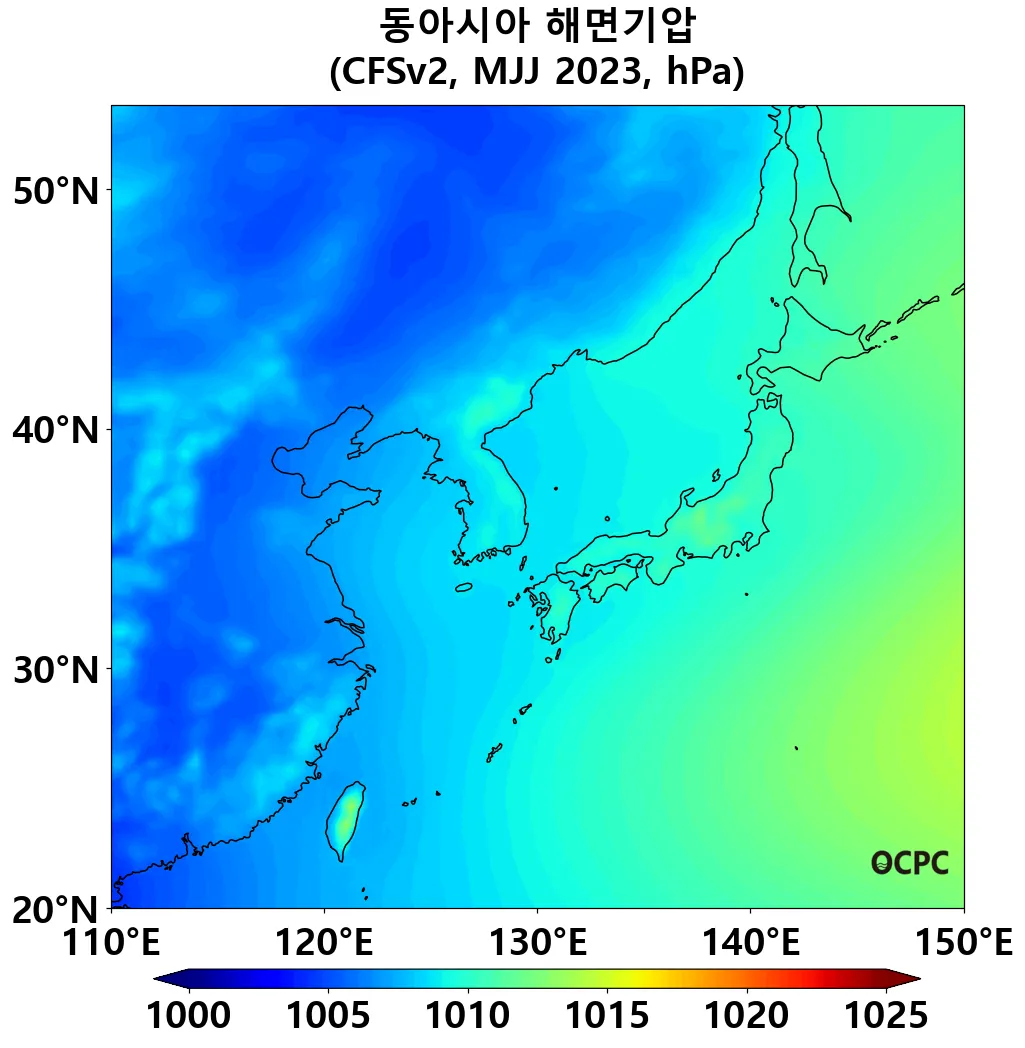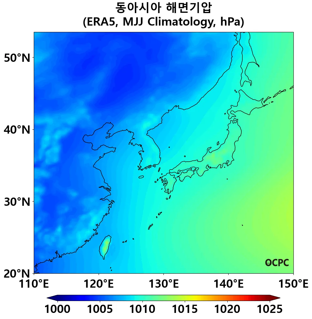 동아시아해역의 5~7월 평균 해면기압은 평년(1010.6±0.9hPa)과 비슷하겠습니다.