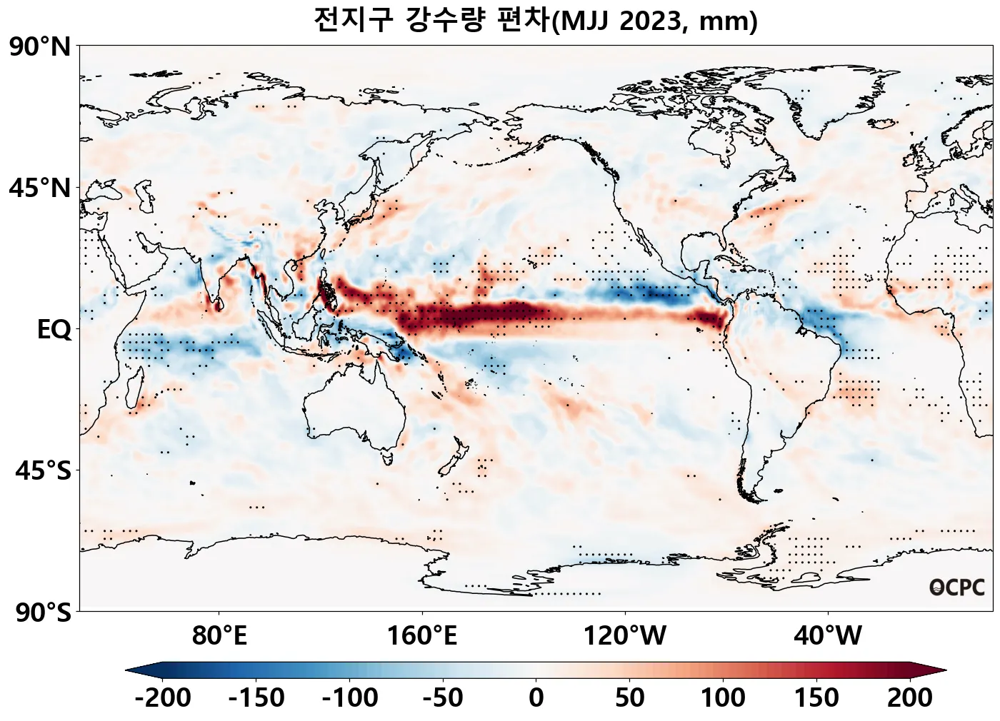A-B. 전지구 강수량 편차 전망(2023년 5~7월 평균, 점표시: 평년 표준편차 초과 해역)