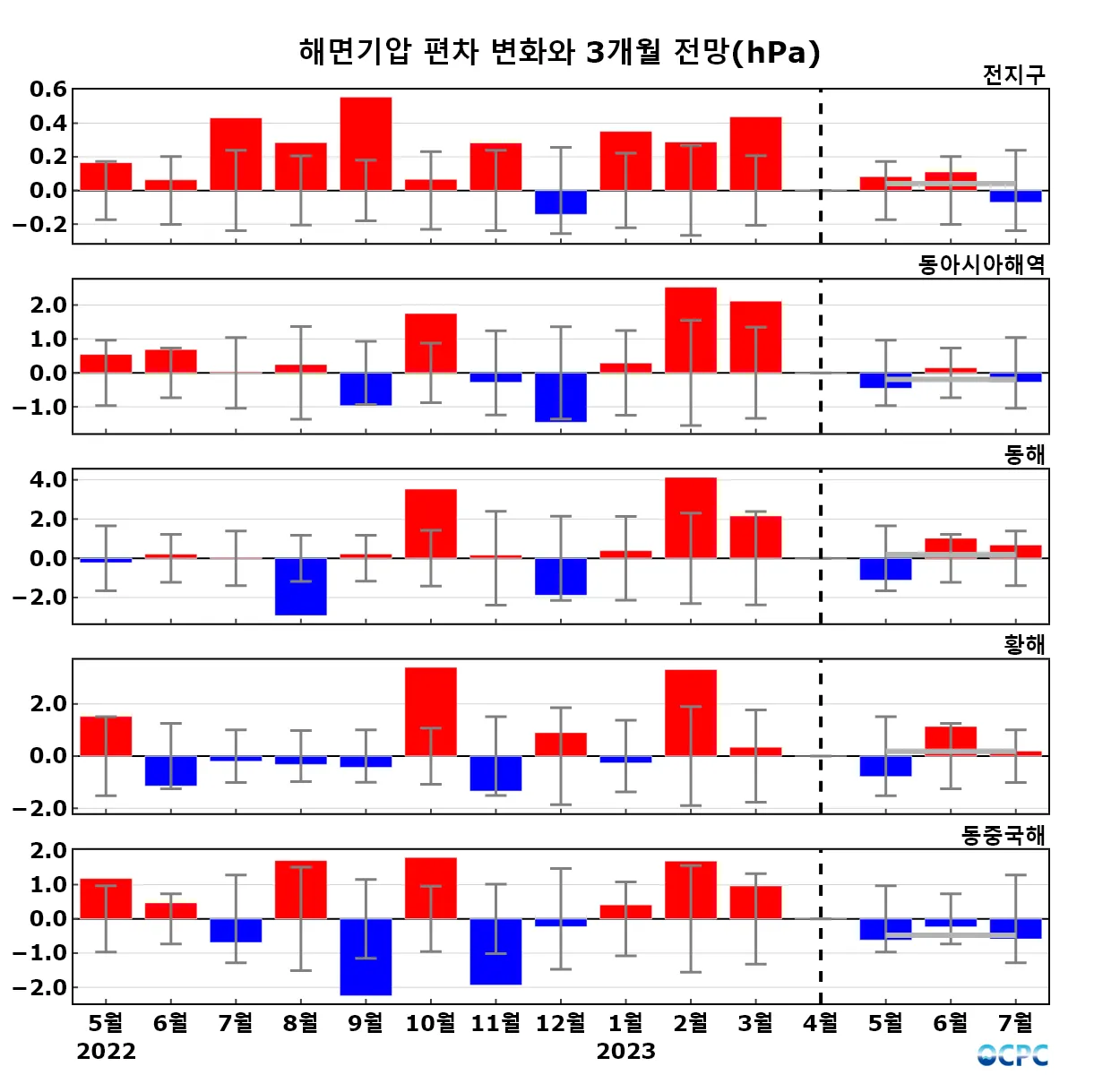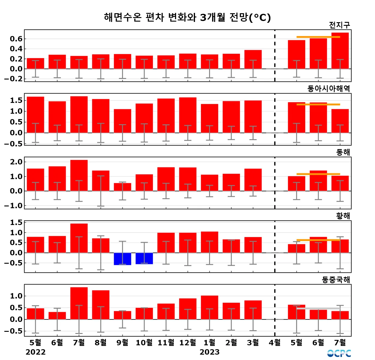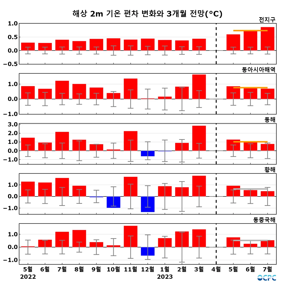 구간표시선: 평년평균±표준편차, 가로실선: 3개월 평균 편차 전망 (주황색: 높음, 회색: 비슷함, 하늘색: 낮음)