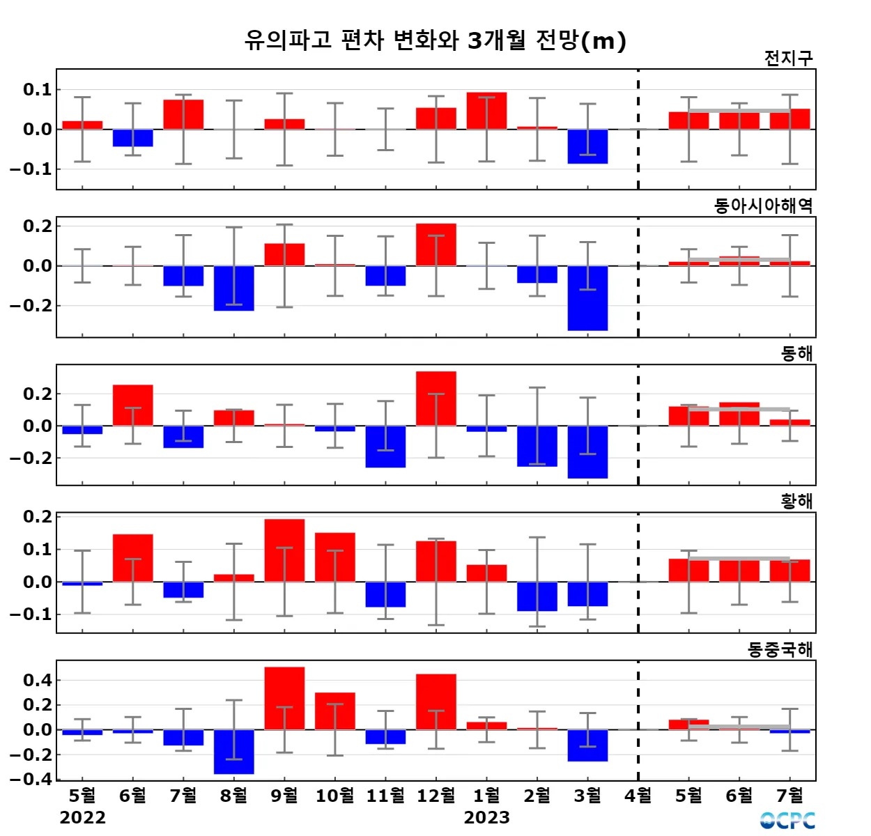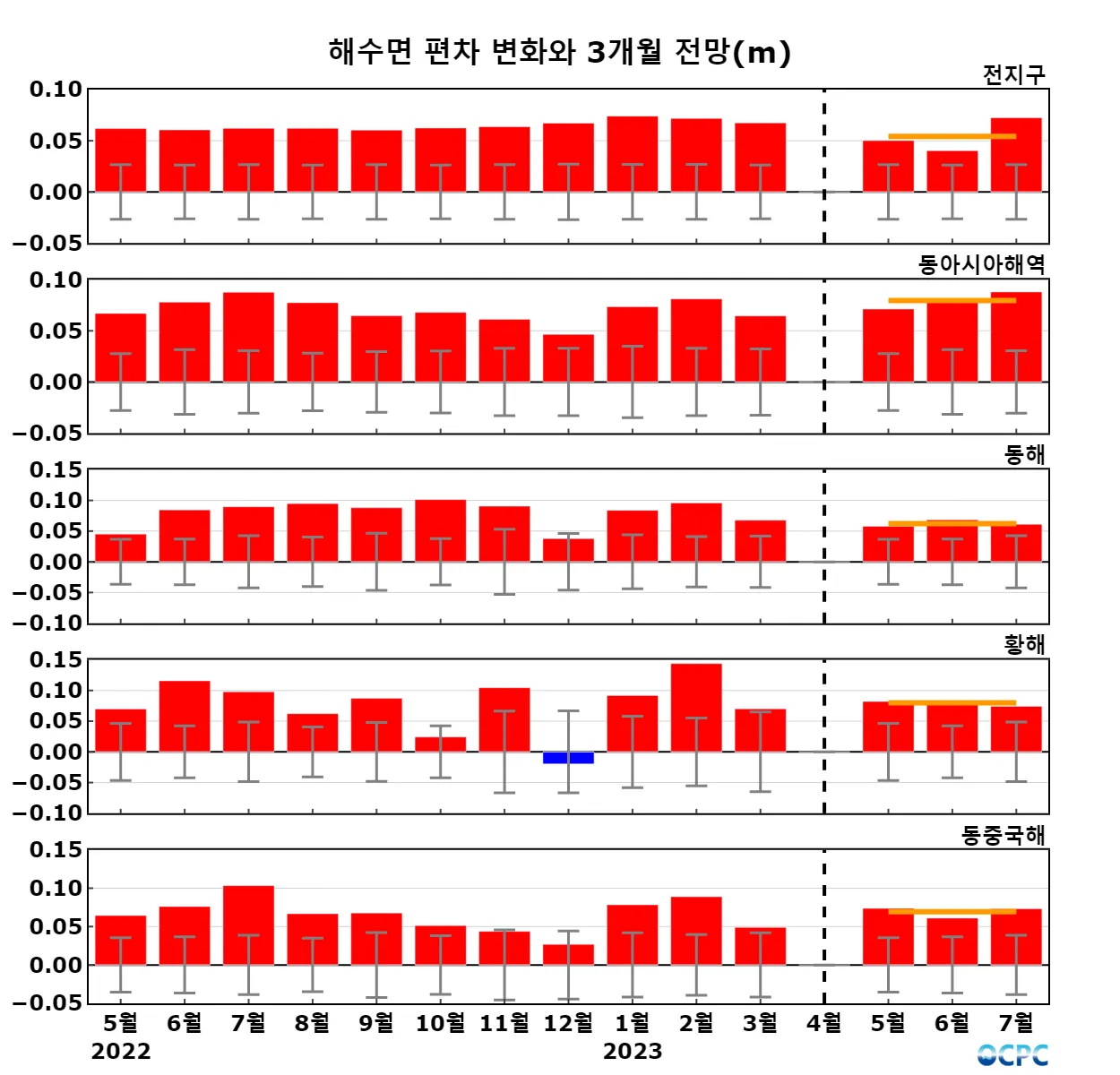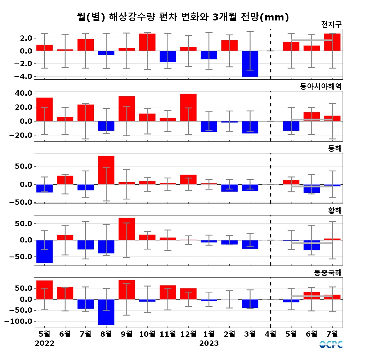 구간표시선: 평년평균±표준편차, 가로실선: 3개월 평균 편차 전망 (주황색: 높음, 회색: 비슷함, 하늘색: 낮음)