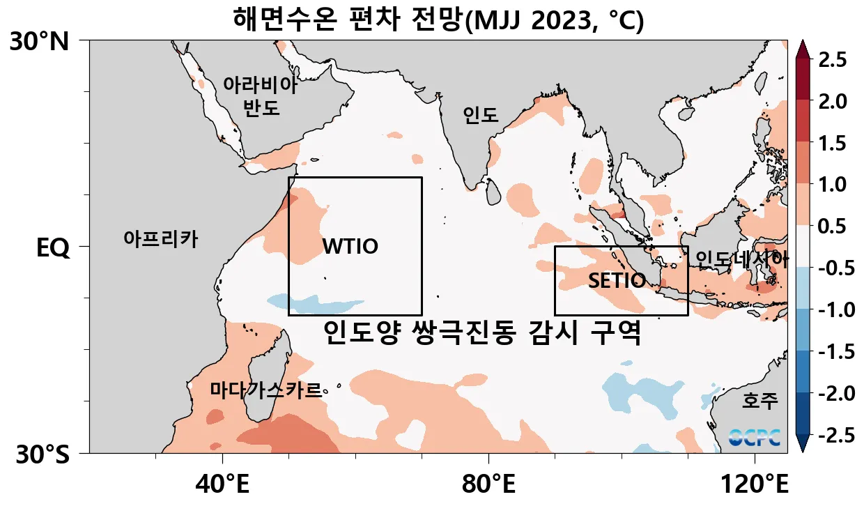 2023년 5~7월 평균 열대 서인도양 해역(WTIO)과 남동인도양 해역(SETIO) 해면수온 편차의 차가 크지 않아 인도양 쌍극진동 지수는 중립 상태일 것으로 전망됩니다.