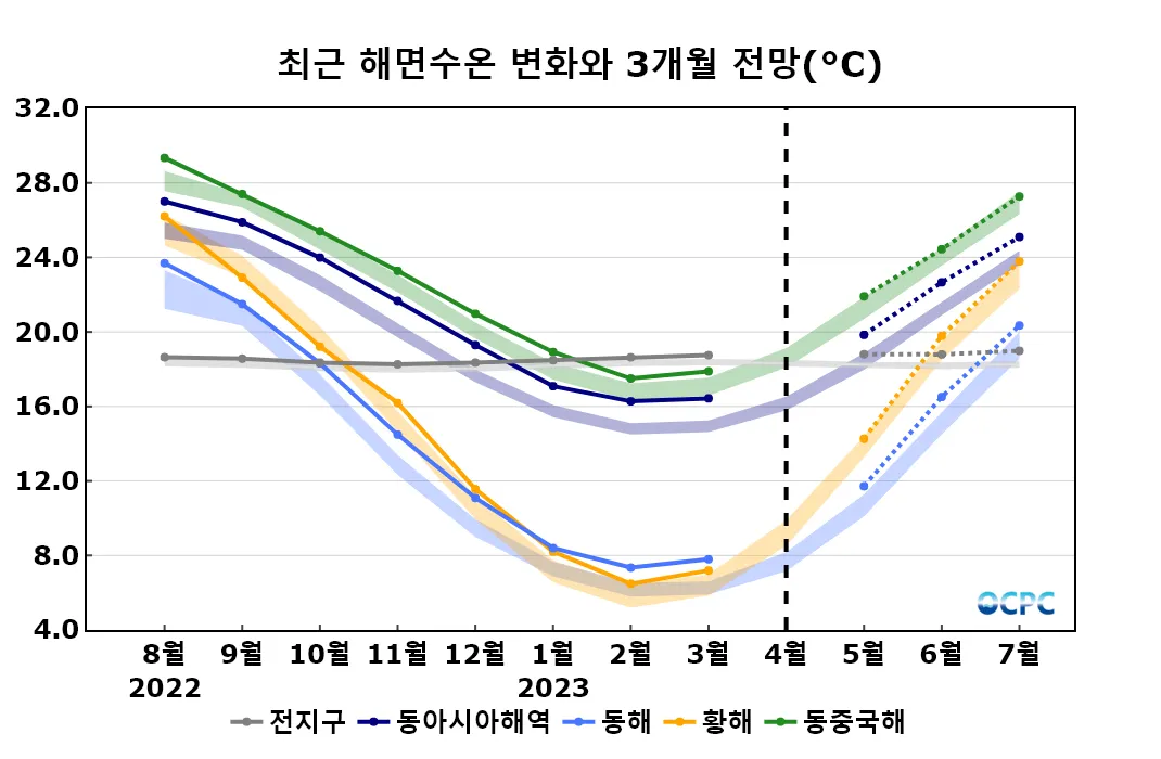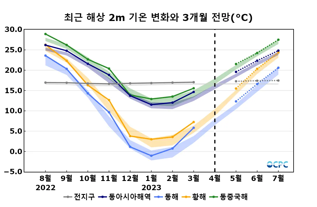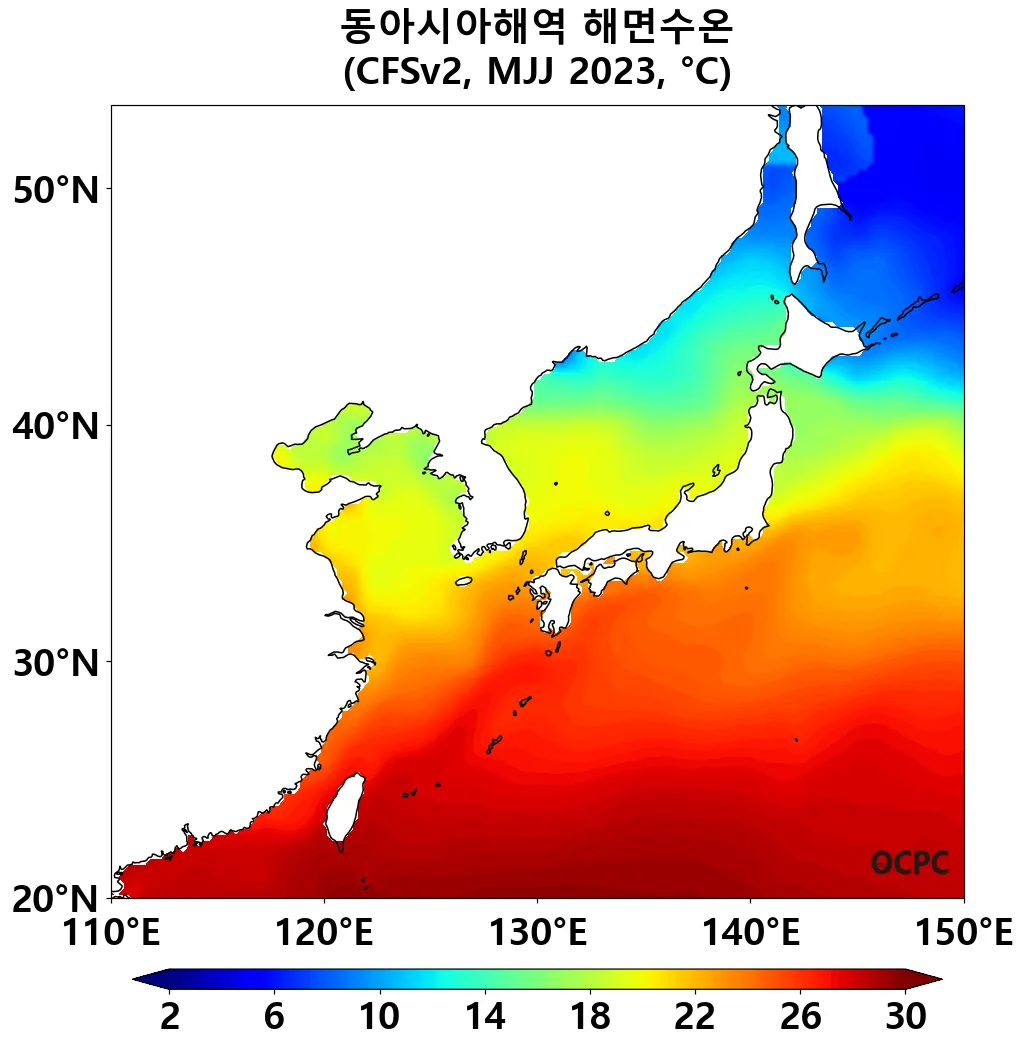 A. 동아시아해역 해상기온 전망(2023년 5~7월 평균)