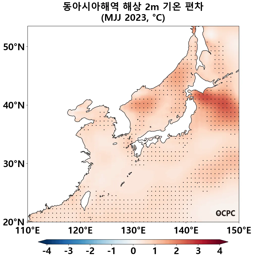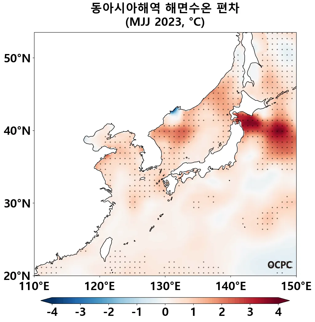 A-B. 동아시아해역 해면수온 편차 전망(2023년 5~7월 평균, 점표시: 평년 표준편차 초과 해역)
