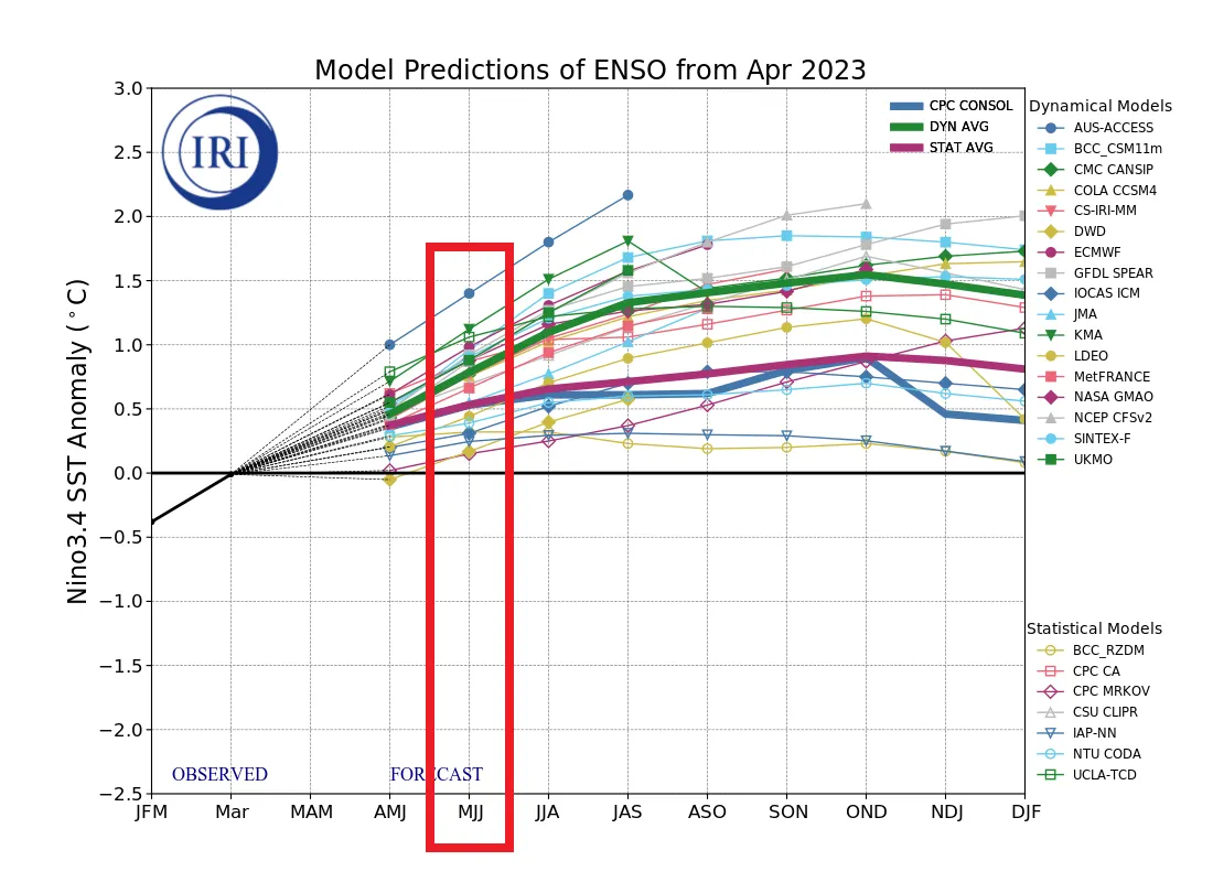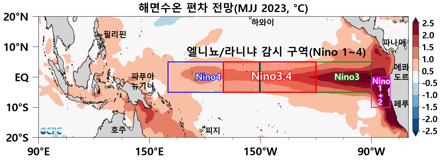 엘니뇨/라니냐 감시구역인 Nino3.4 해역(5°S~5°N, 170°W~120°W)의 5~7월(MJJ) 평균 해면수온 편차는 0.5°C 이상으로 엘니뇨 상태일 것으로 전망됩니다.