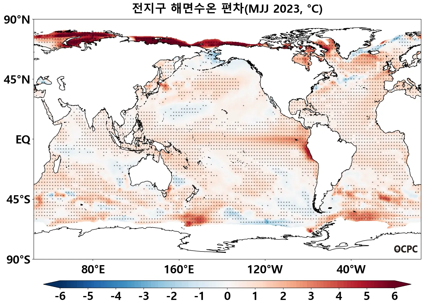 A-B. 전지구 해면수온 편차 전망(2023년 5~7월 평균, 점표시: 평년 표준편차 초과 해역)