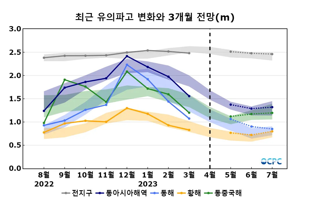 동해, 황해, 동중국해의 평균 유의파고는 평년(0.9±0.1m, 0.8±0.1m, 1.2±0.1m)과 비슷할 것으로 전망됩니다.