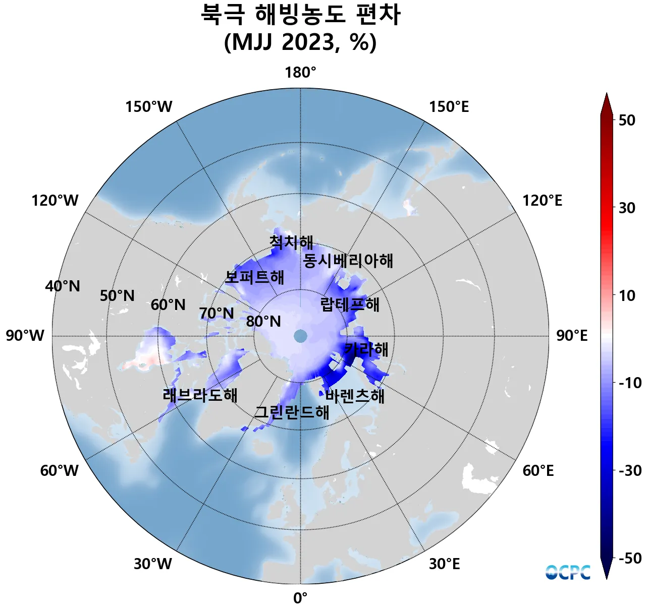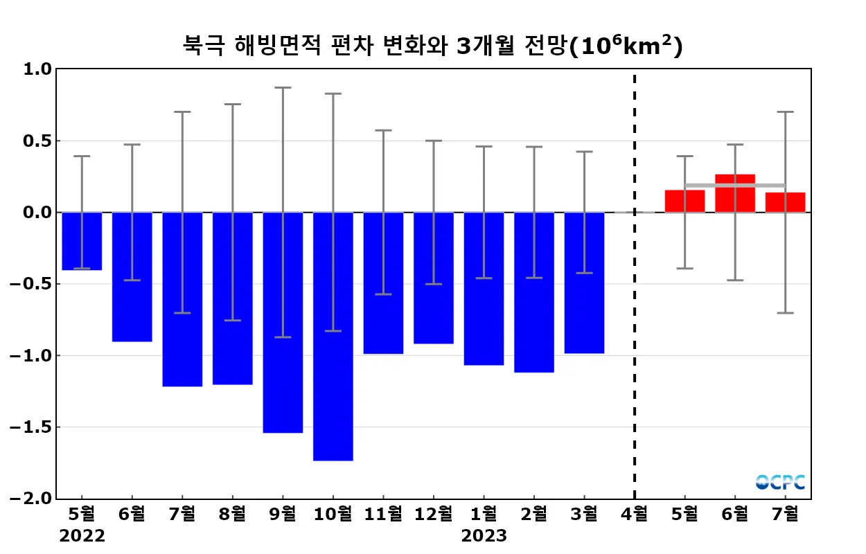 A-B. 북극 해빙농도 편차 전망(2023년 5~7월 평균, 15% 이상 해역)