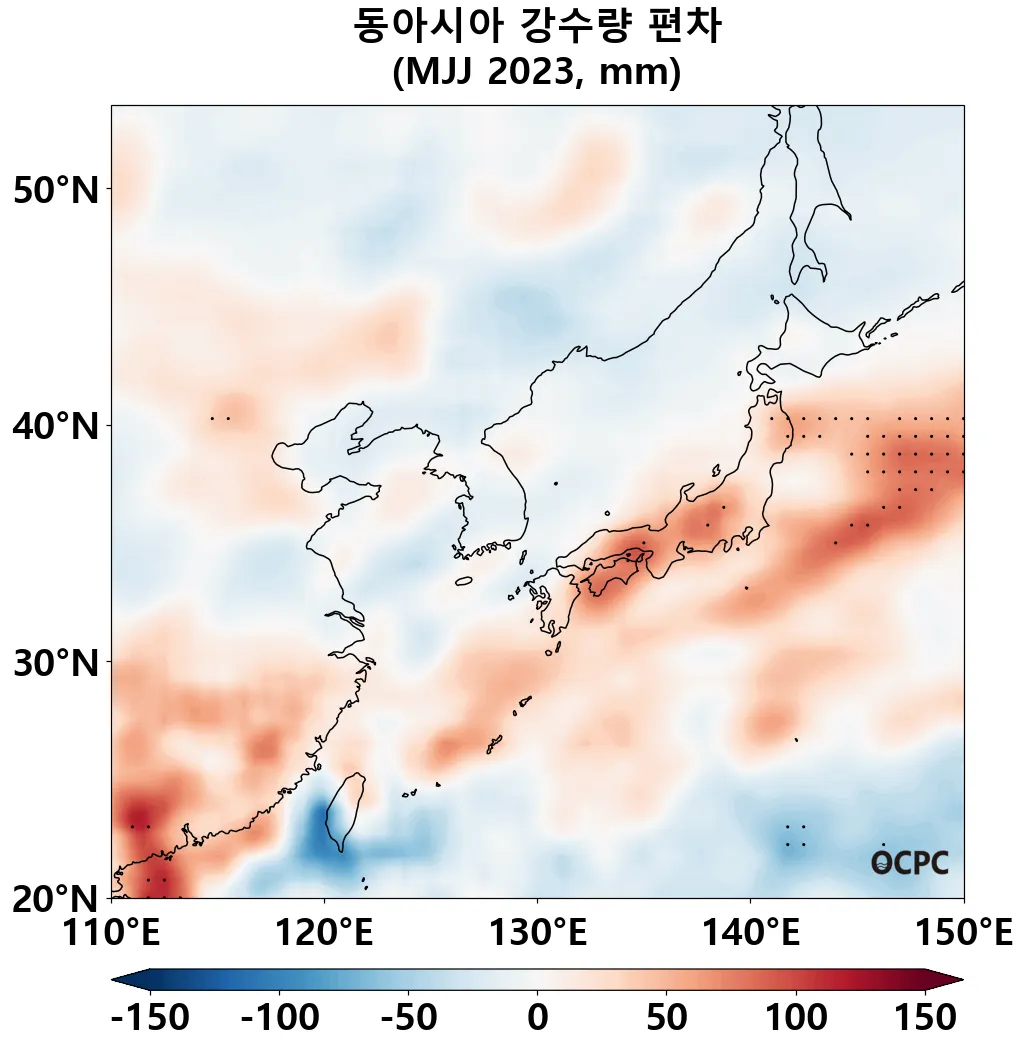 A-B. 동아시아 강수량 편차 전망(2023년 5~7월 평균, 점표시: 평년 표준편차 초과 해역)