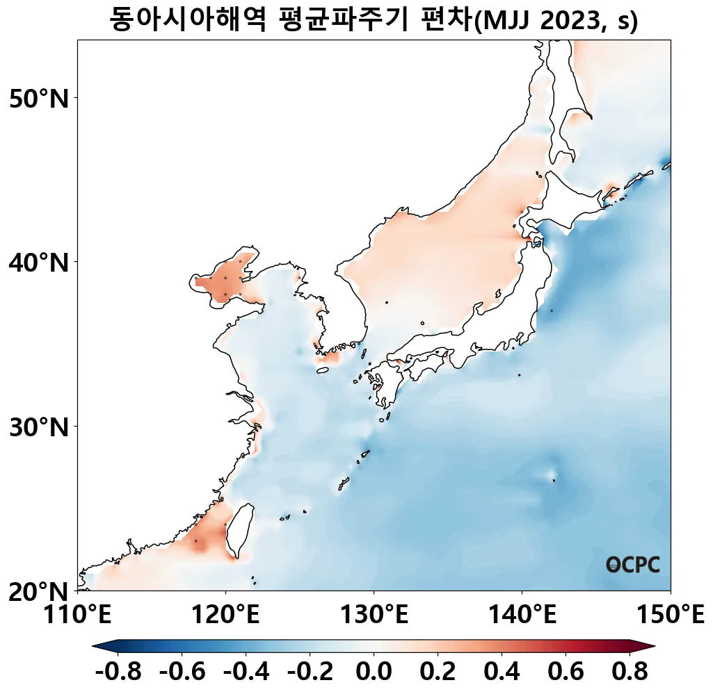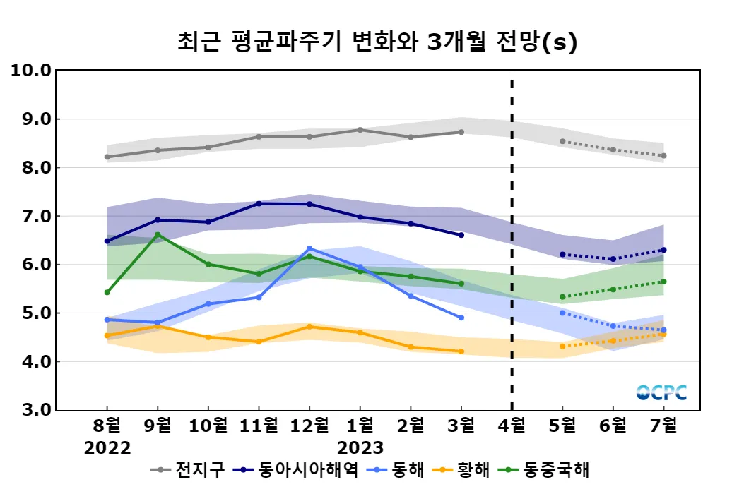동해, 황해, 동중국해의 평균파주기는 평년(4.8±0.3초, 4.4±0.2초, 5.5±0.3초)과 비슷할 것으로 전망됩니다.