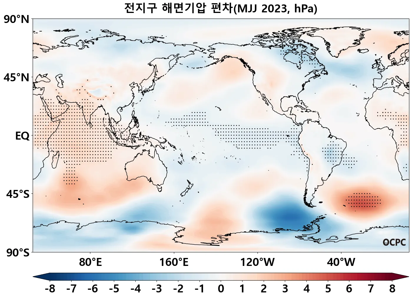 A-B. 전지구 해면기압 편차 전망(2023년 5~7월 평균, 점표시: 평년 표준편차 초과 해역)
