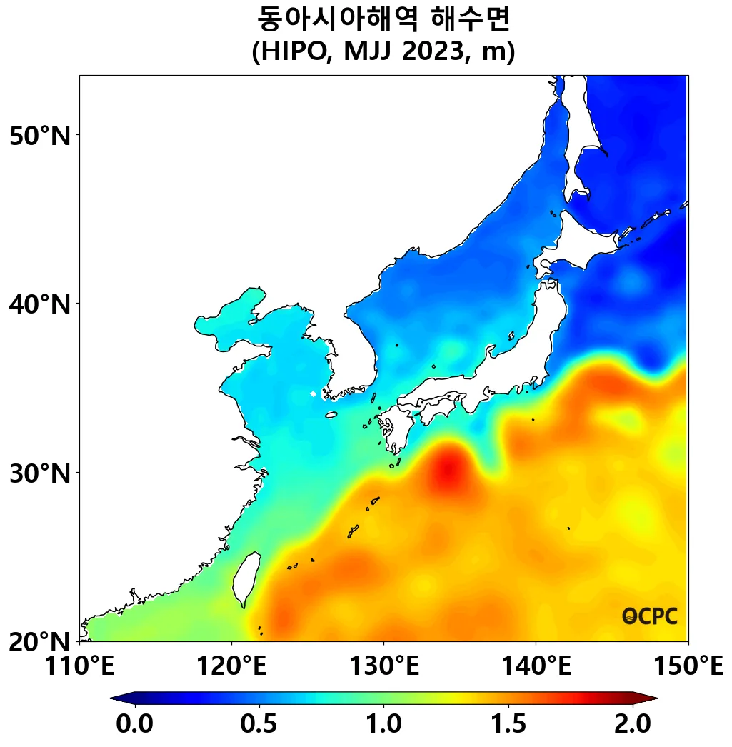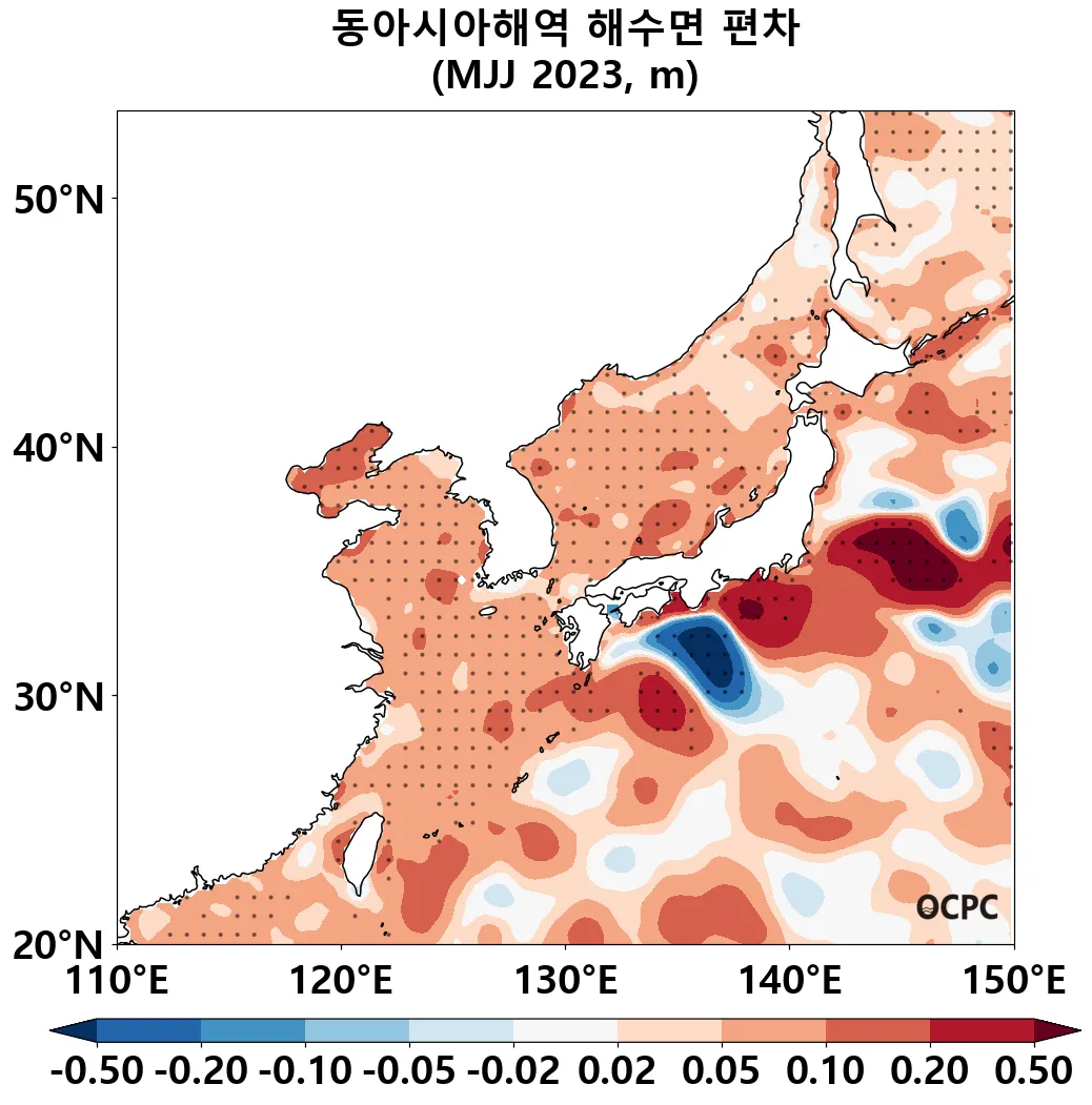 A. 동아시아해역 해수면 전망(2023년 5~7월 평균)