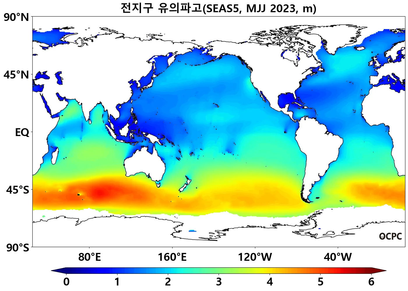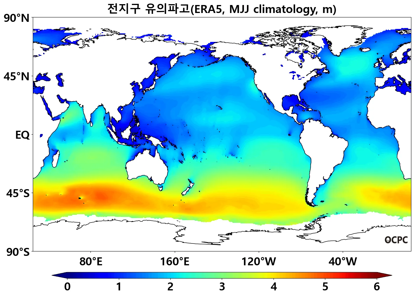 전지구 평균 유의파고는 평년(2.4±0.1m)과 비슷하겠습니다.