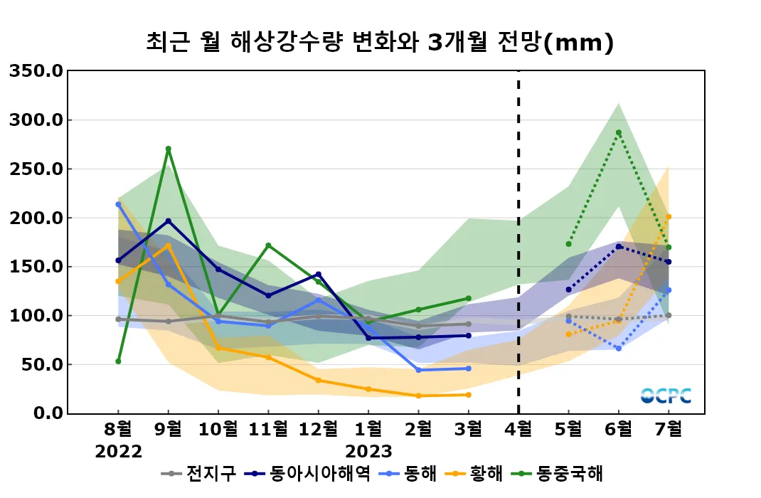 동해, 황해, 동중국해의 5~7월 평균 해상강수량은 평년(113.4±28.1mm, 117.7±43.4mm, 186.2±52.3mm)과 비슷하겠습니다.